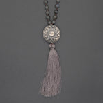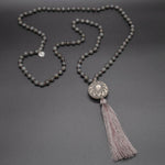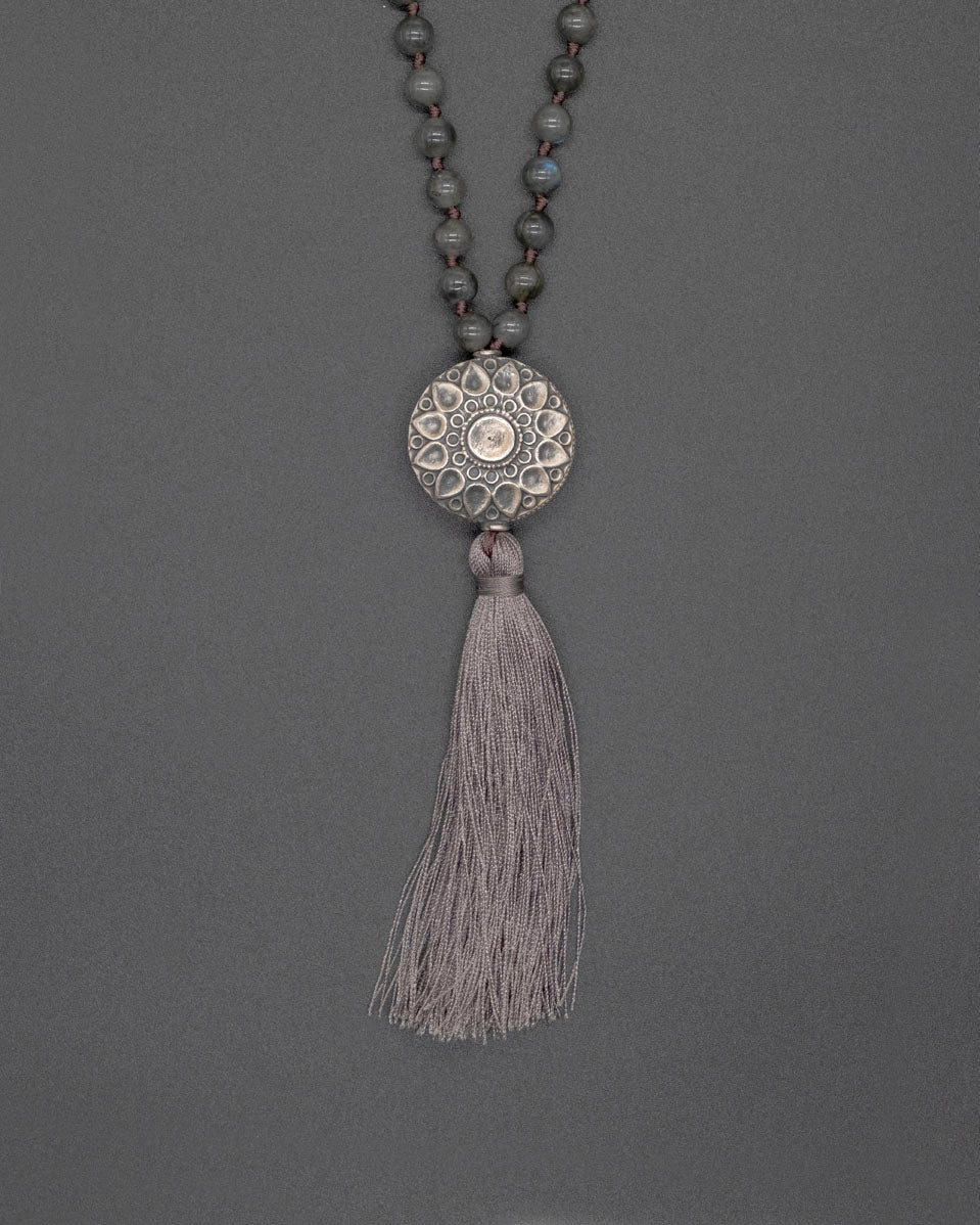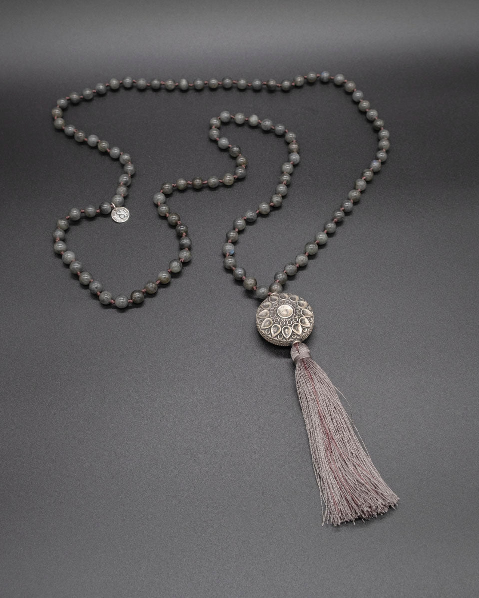 The Grey Flower 108 black moonstone bead mala is a reminder of your spiritual journey. Crafted with exquisite attention to detail, this mala features a vintage Rahjistan silver guru bead that holds special significance in ancient Hinduism. The black moonstone beads have a powerful energy that provides a sense of grounding and balance.