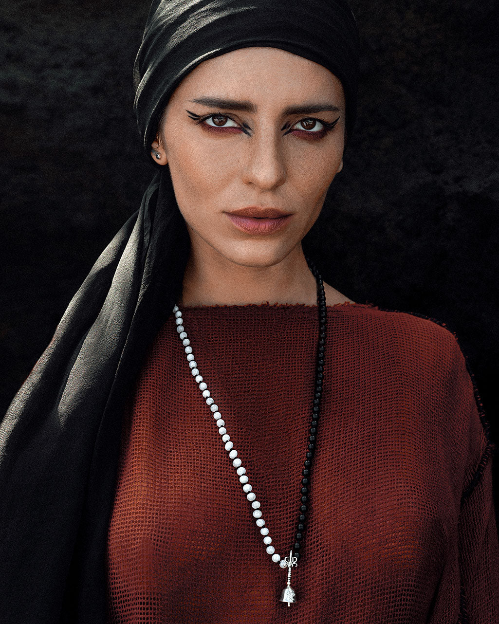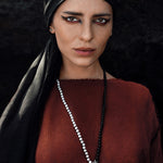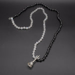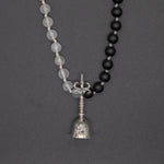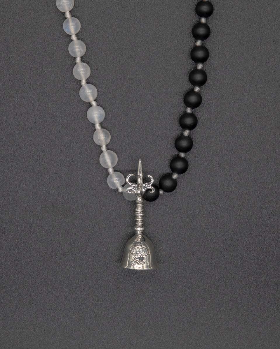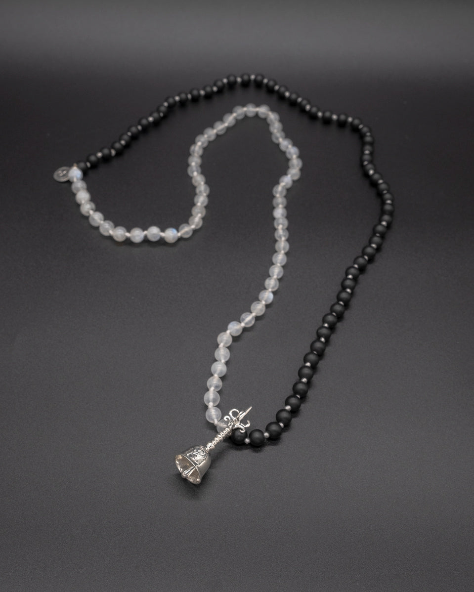 Calming, peaceful, and harmonious, this beautiful mala necklace with 108 white moonstones and black onyx beads, accented by a sterling silver Balinese bell with a Balinese Om carved on it.