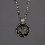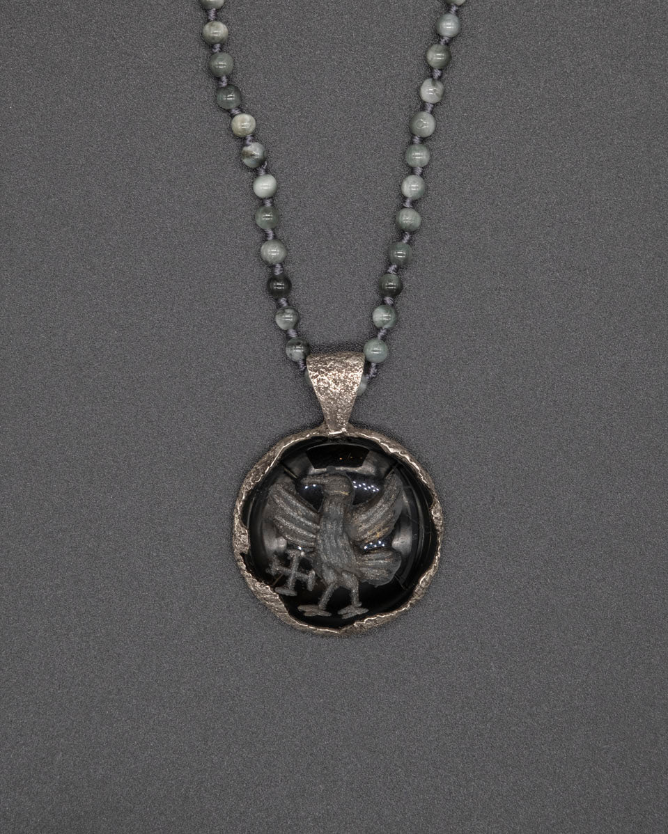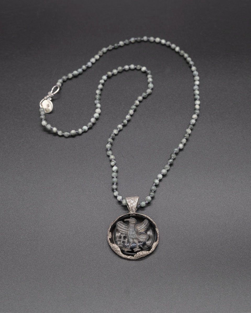 Soar into the skies with this one-of-a-kind black hawk pendant, carved in black onyx and framed in silver. This piece is complemented with a hand-knotted eagle's eye chain, providing a perfect balance of texture and reflection.