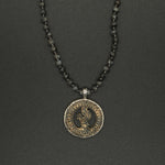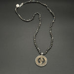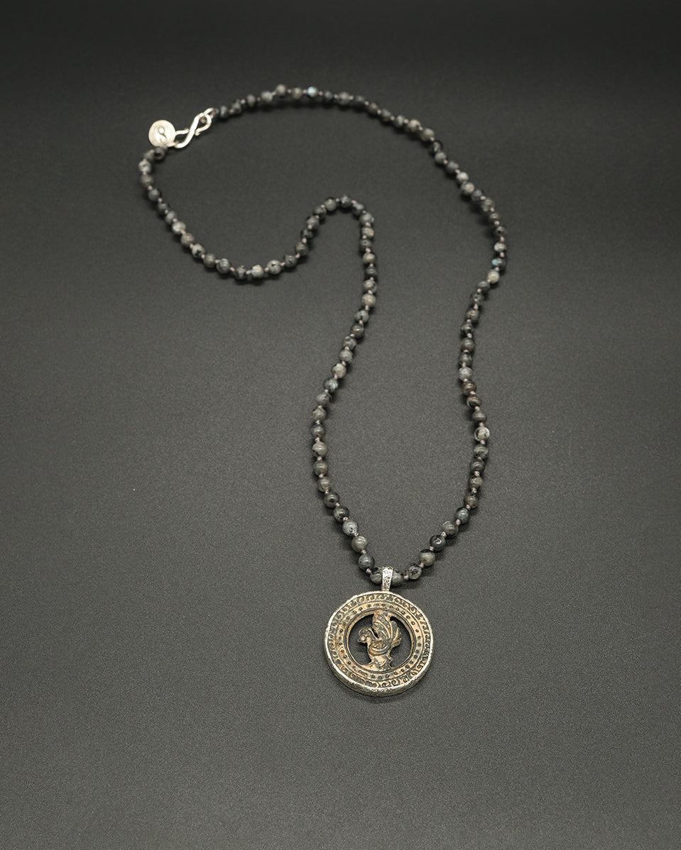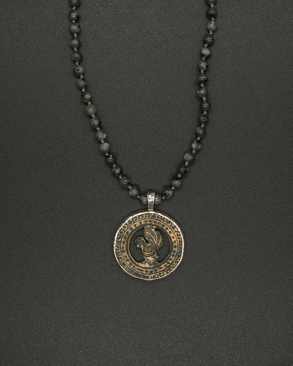 With its vintage Tibetan amulet and hand-knotted larvikite chain, the Grey Bird necklace is striking. Featuring a majestic Phoenix, carved from clay and bound in dusted silver, this necklace symbolizes renewal and hope.