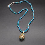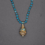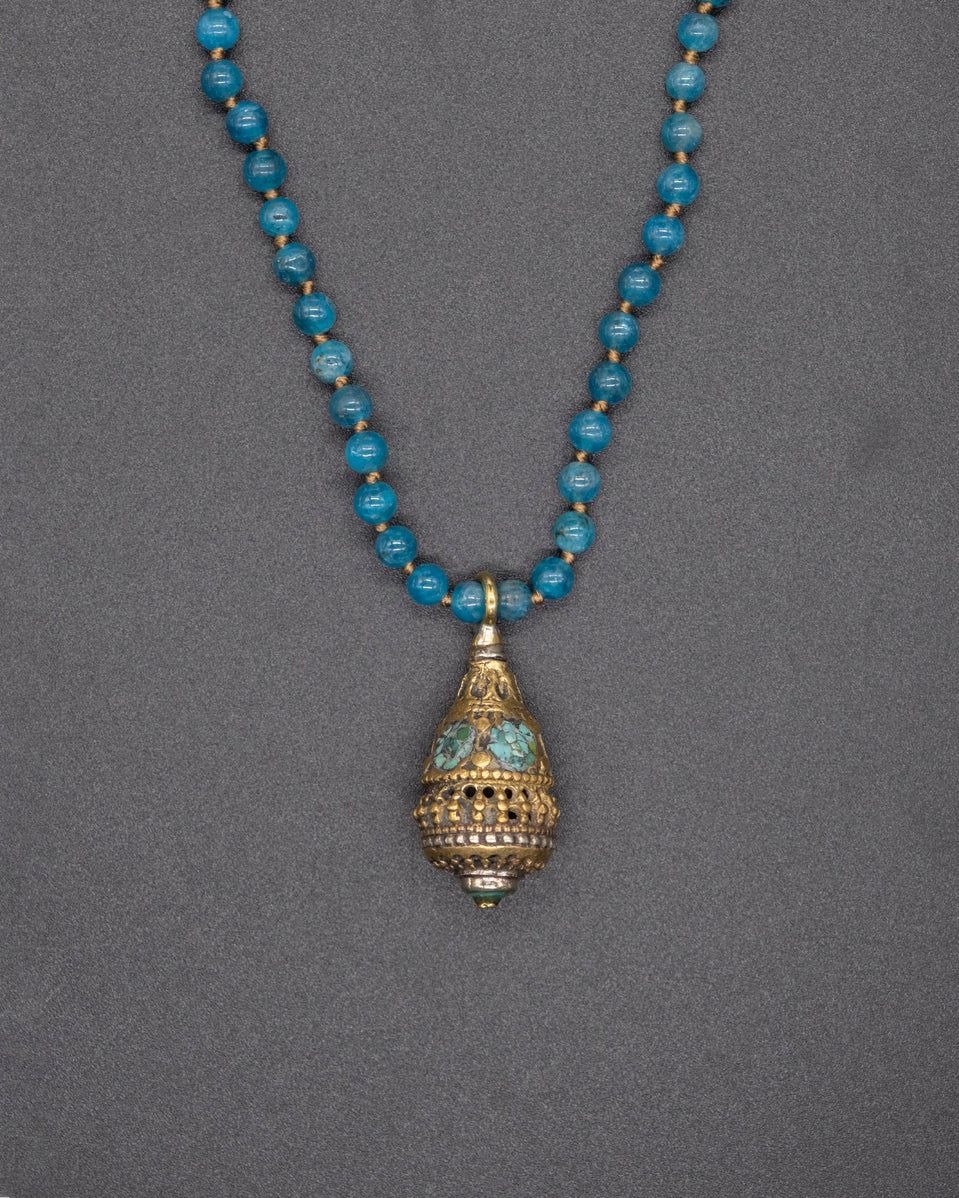 Discover the charm of this Vintage Nepalese Pendant, adorned with turquoise and framed in warm brass. The pendant hangs on a hand-knotted apatite beaded chain, combining craftsmanship and natural beauty. Turquoise symbolizes protection and harmony, while apatite inspires clarity and balance — together creating a soulful piece that reflects both heritage and healing energy.