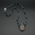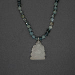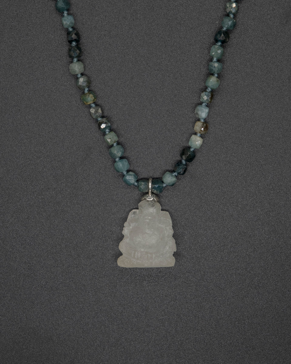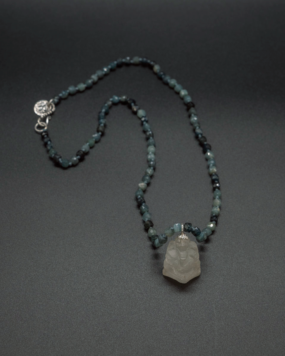 An intricately carved crystal quartz Ganesha pendant pairs up with a hand-knotted blue tourmaline necklace. As the symbol of wisdom, Ganesha is said to provide protection as well as removal of obstacles.