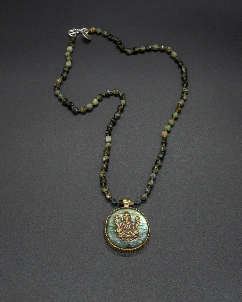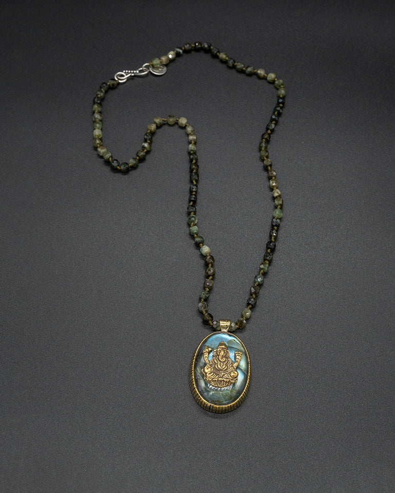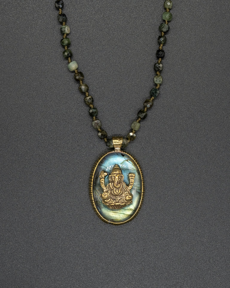A radiant brass Ganesha pendant set with shimmering labradorite, representing wisdom, protection, and transformation. The pendant is beautifully paired with a hand-knotted green garnet chain, blending earthy elegance with spiritual energy for a truly meaningful adornment.