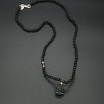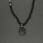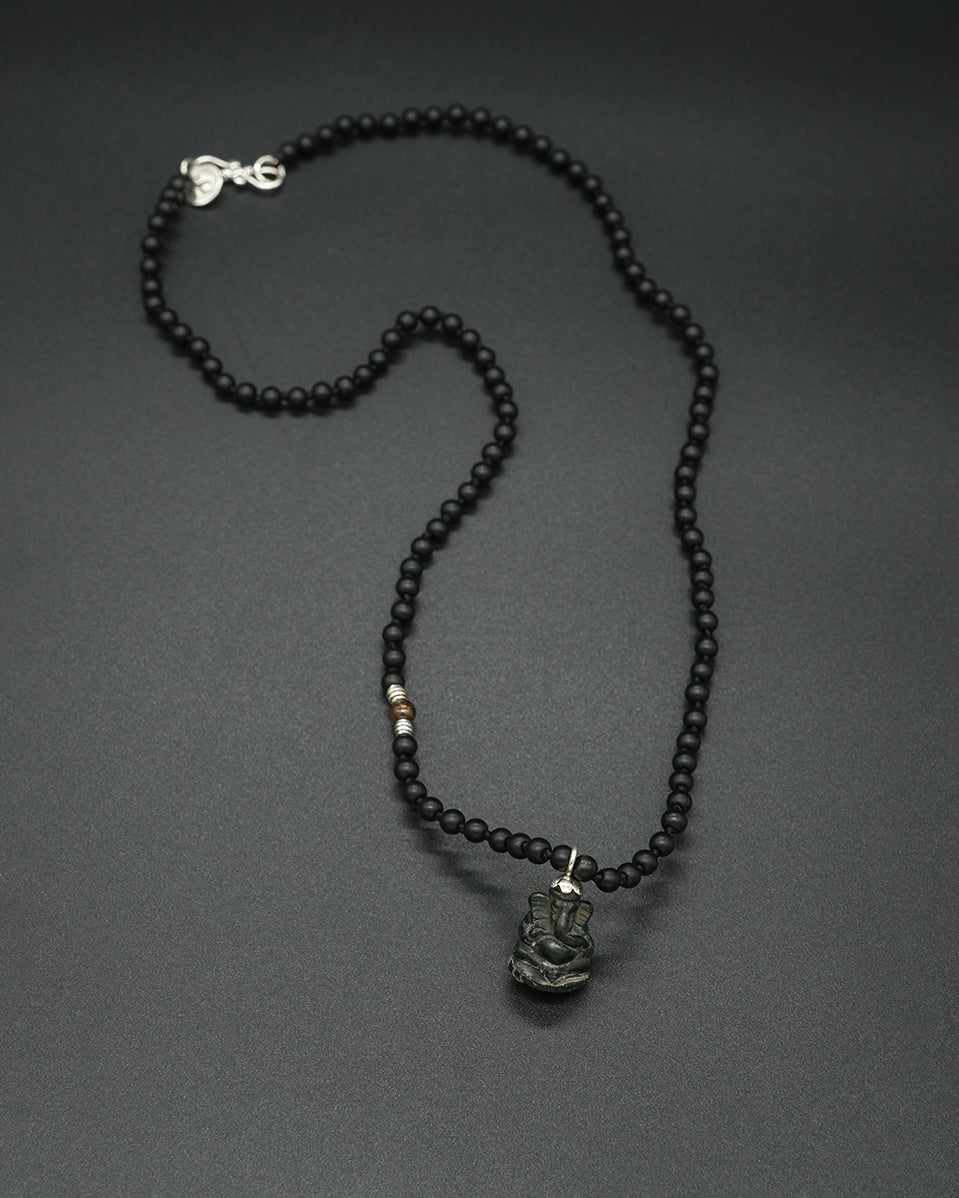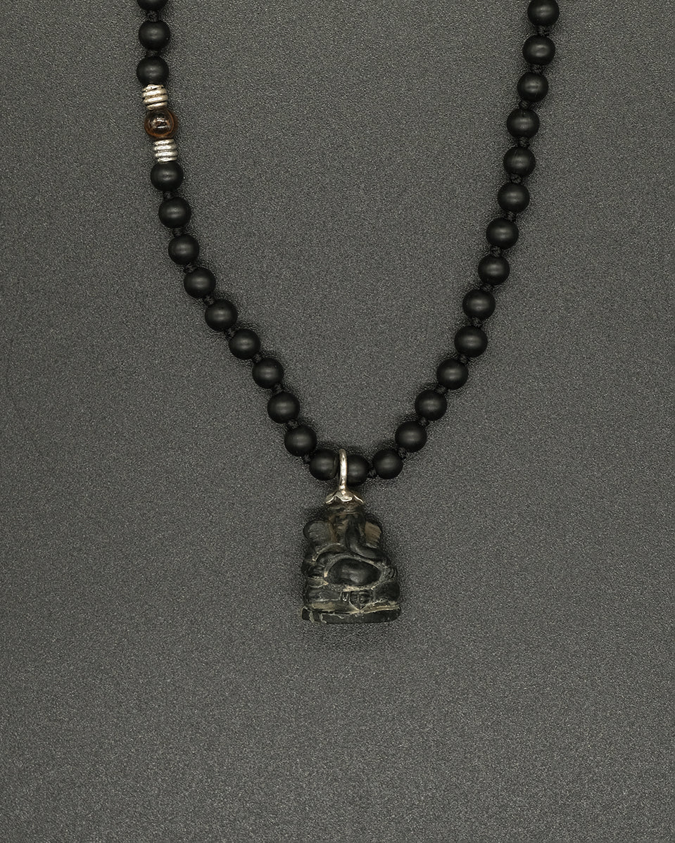 This onyx carved Ganesha pendant is handcrafted, paired with hand knotted onyx stone, with accents of silver & tiger eye. Remember Ganesha, the remover of obstacles, with this one-of-a-kind piece.