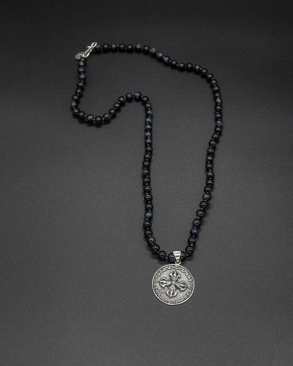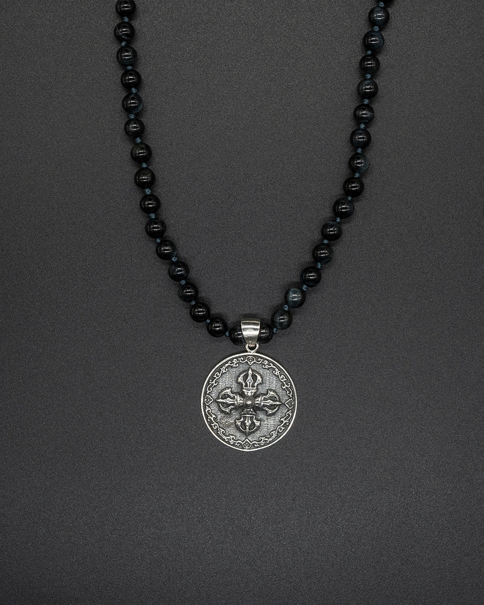 Crafted with genuine silver and paired with a stunning blue tiger eye chain, this piece is a powerful symbol of compassion and enlightenment. Let the Vajra guide you on your journey towards inner peace and strength.