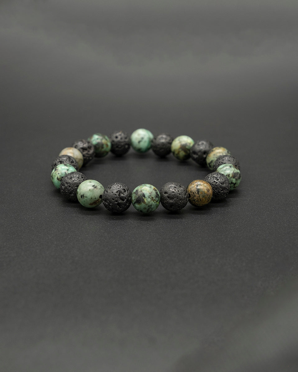 Alternating lava stones and African turquoise create a captivating look that effortlessly connects you to the earth.