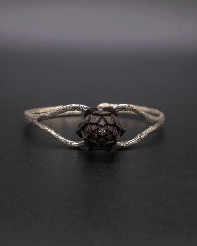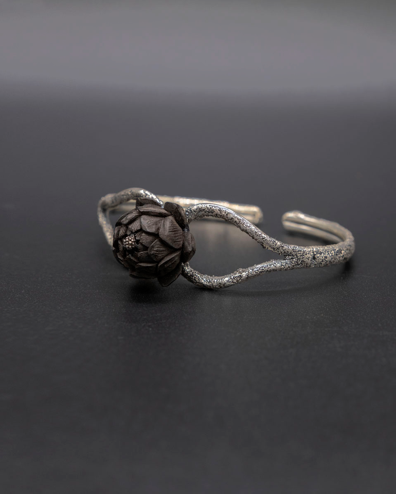 Indulge in spiritual growth with our exclusive Black Lotus Cuff. Meticulously hand-carved from pristine Ebony wood and expertly crafted onto a sterling silver cuff, this piece is a testament to the artistry and skill of our artisans. The lotus flower represents the journey toward enlightenment, and our cuff embodies this ideal with its delicate yet sturdy design.