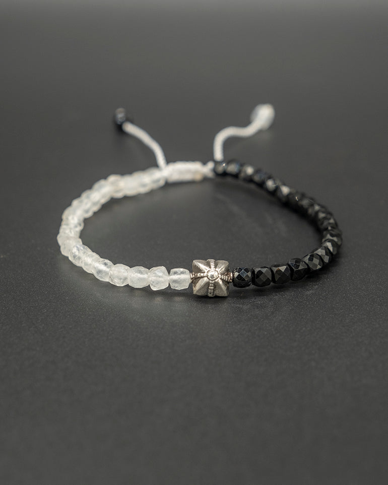 Calming, peaceful, and harmonious, this beautiful bracelet with white moonstones and black spinel beads, accented by a sterling silver Balinese bead.
