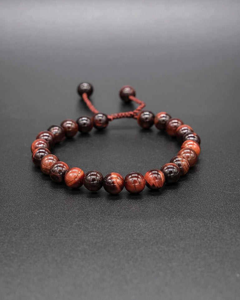 Give yourself a bit of protection with this unique red tiger-eye hand-made bracelet. Red tiger-eye has been worn historically for centuries to ward off bad spirits and protect its wearer. This bracelet fits all sizes and is adjustable.
