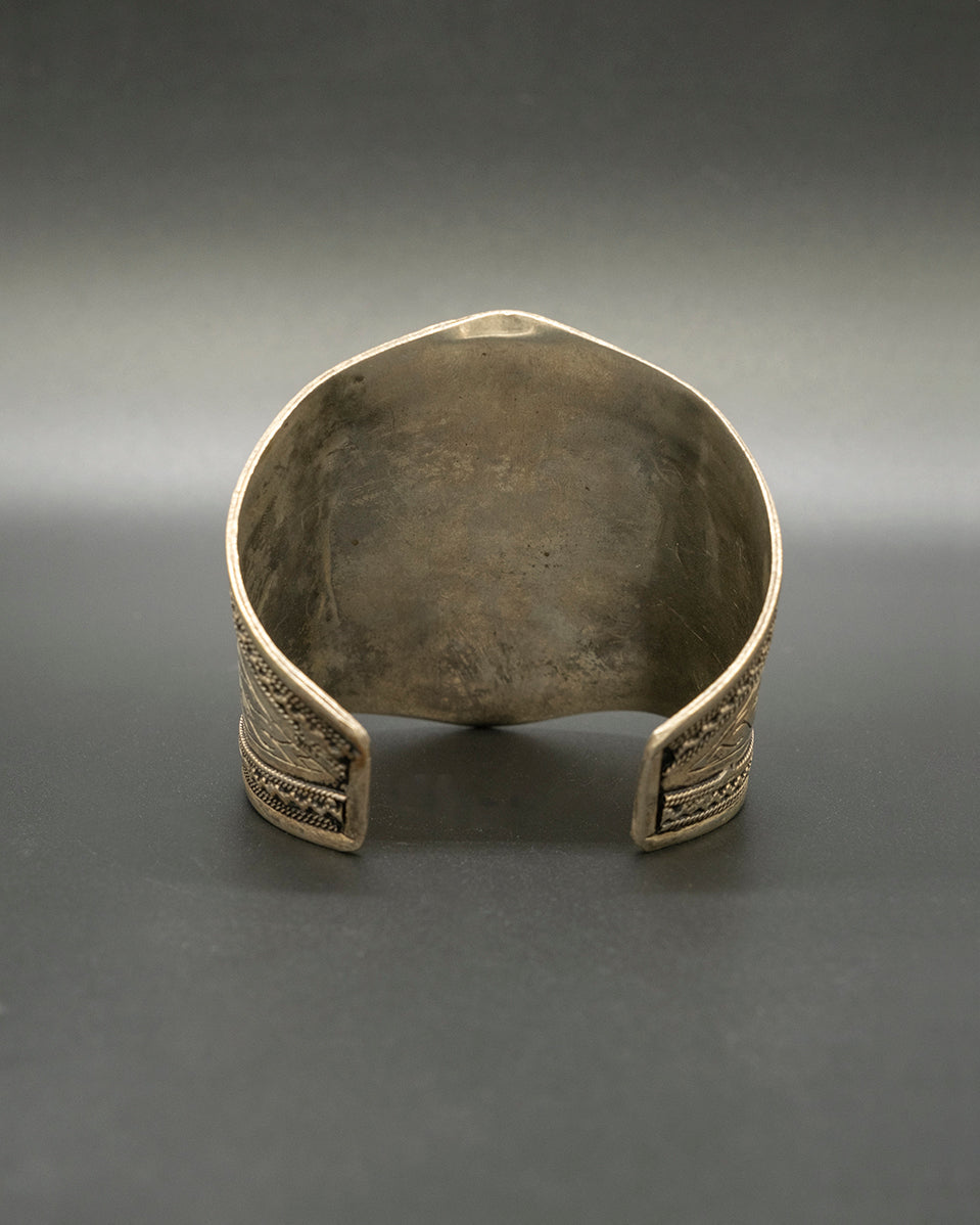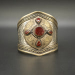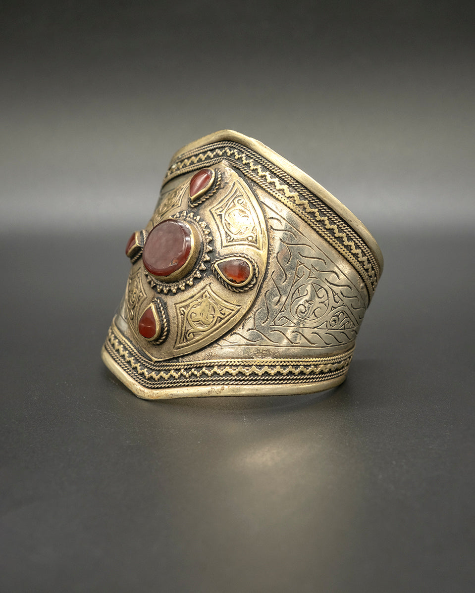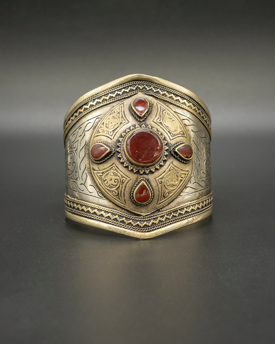 This vintage cuff is a beautiful homage to traditional tribal jewelry, expertly crafted from high-quality antique brass. The unique carnelian stone placement symbolizes the four directions of your journey, making this vintage cuff from Turkmenistan not just a bracelet, but a captivating work of art that may guide you on your journey.
