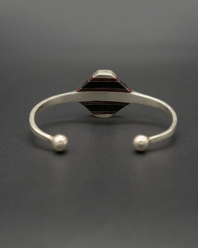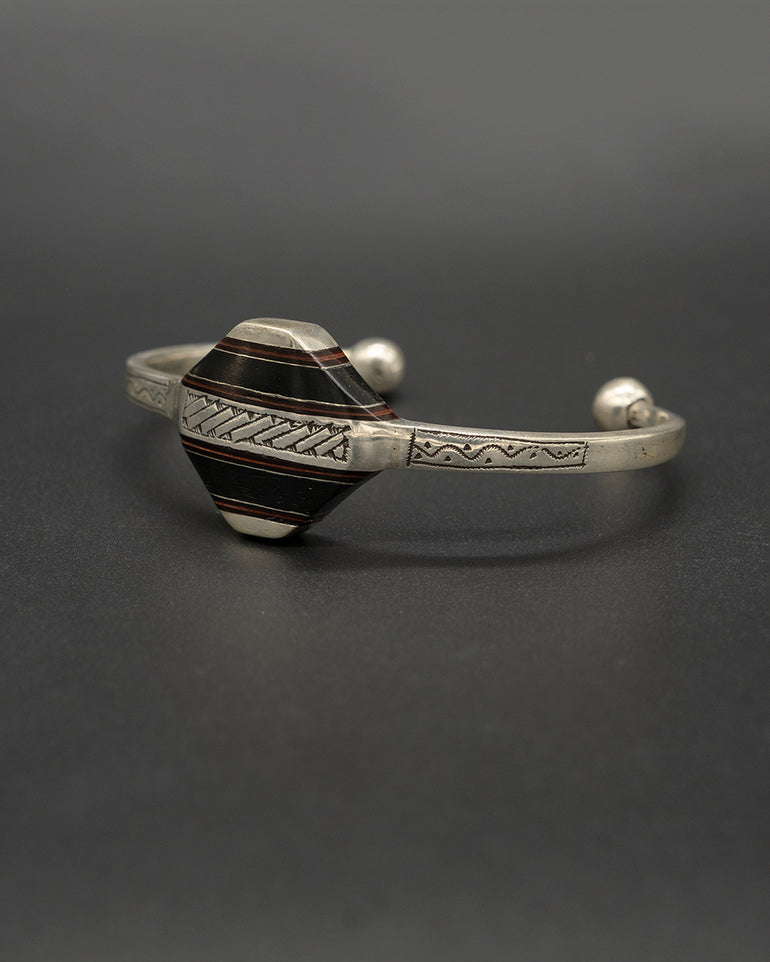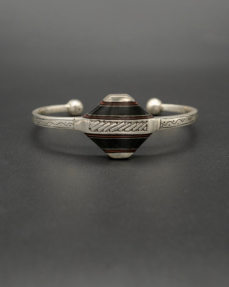 This unique silver and wood cuff captures the essence of the traditional Tuareg design. Nomads of the desert, the Tuareg inhabit a vast territory spanning from the Moroccan Saharan desert to Burkina Faso in the south.