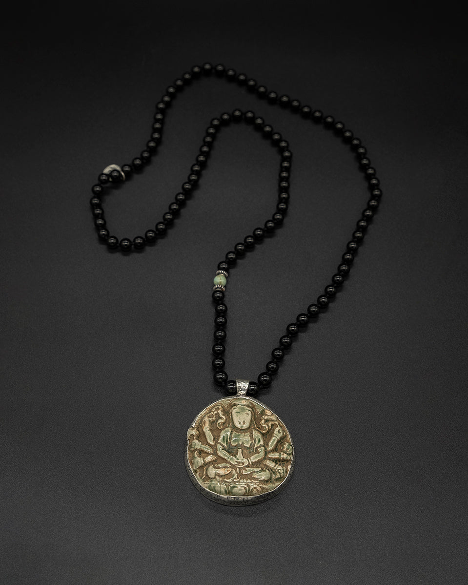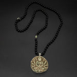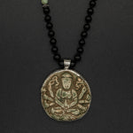 Skillfully carved from clay and delicately framed with silver, this vintage pendant encapsulates the timeless beauty of the Bodhisattva. Suspended on a hand-knotted black tourmaline chain, accented with wood opal & silver, it emits a captivating aura of peace and spirituality.