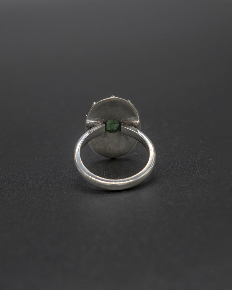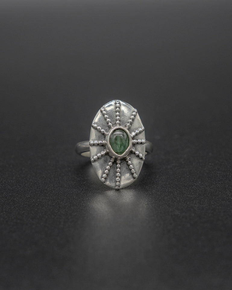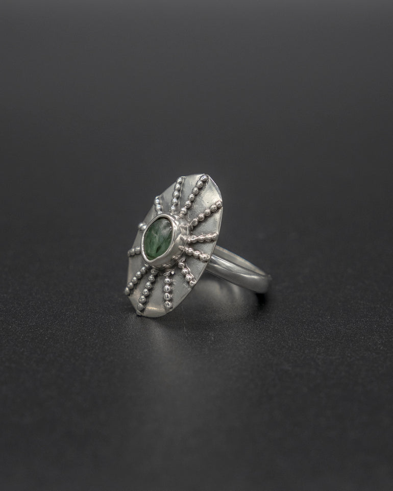 This magnificent ring features a breathtaking raw cut emerald surrounded in hand-set sterling silver detail, designed to capture the essence of the tattooed face of Myanmar women.