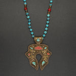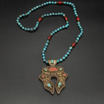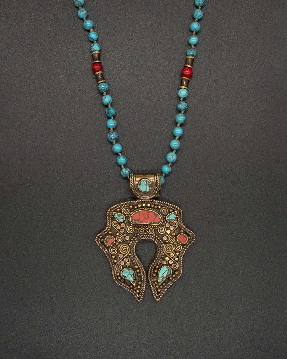 This vintage Nepalese brass pendant is intricately designed with coral and turquoise accents, making it truly one-of-a-kind. It is paired with a gorgeous hand-knotted turquoise, coral, & brass chain.