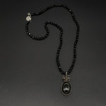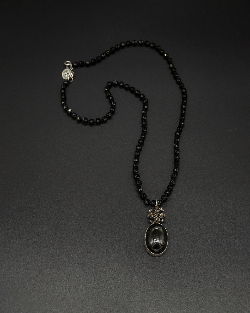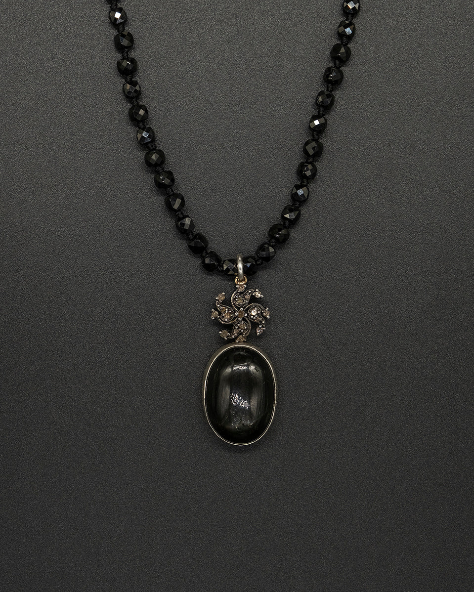 A bold combination of deep black sapphire set in sleek silver, highlighted with subtle diamond shimmer and finished with a refined black spinel chain. Dark, elegant, and full of quiet power—crafted for a sophisticated, modern edge.