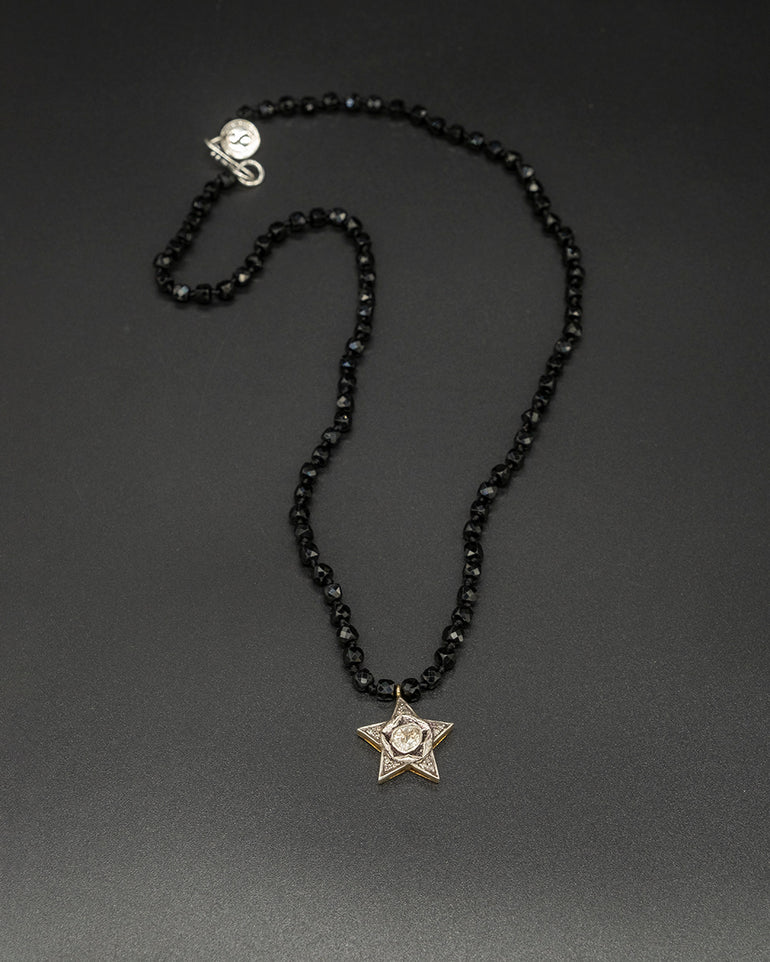 Raw Polki diamonds radiate antique brilliance, paired with a hand-knotted black spinel chain. A bold and elegant piece that balances grounding energy with timeless luminosity.
