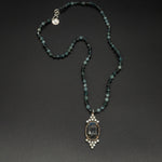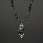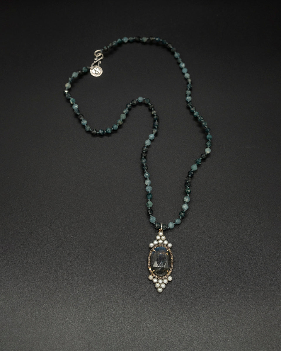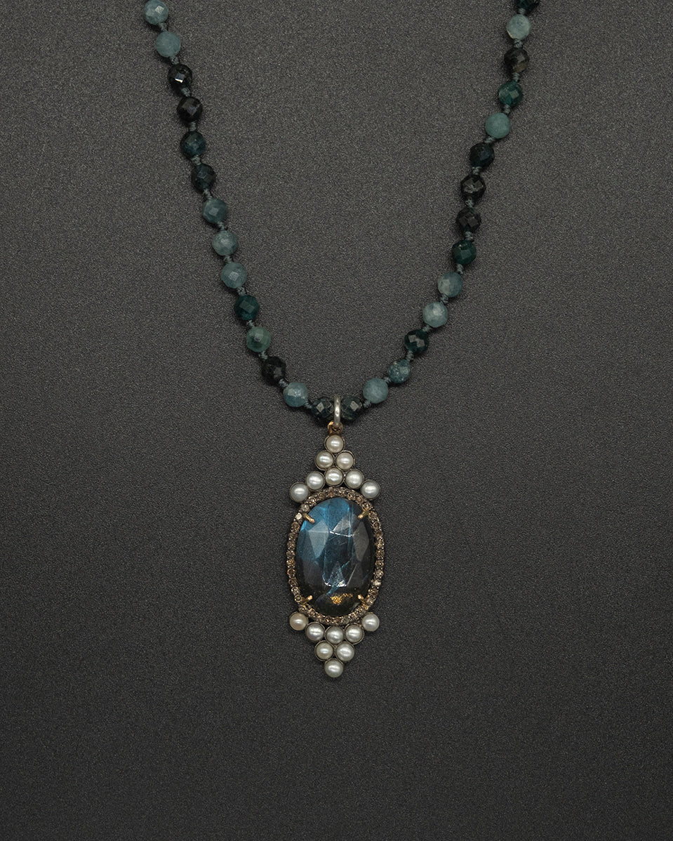 Luminous white South Sea pearls pair beautifully with glowing labradorite and subtle diamond accents. Rich blue tourmaline stones flow into a refined hand-knot blue tourmaline chain, creating a smooth blend of light, depth, and ocean-blue energy. A clean, elegant piece with a calm and sophisticated presence.