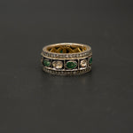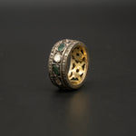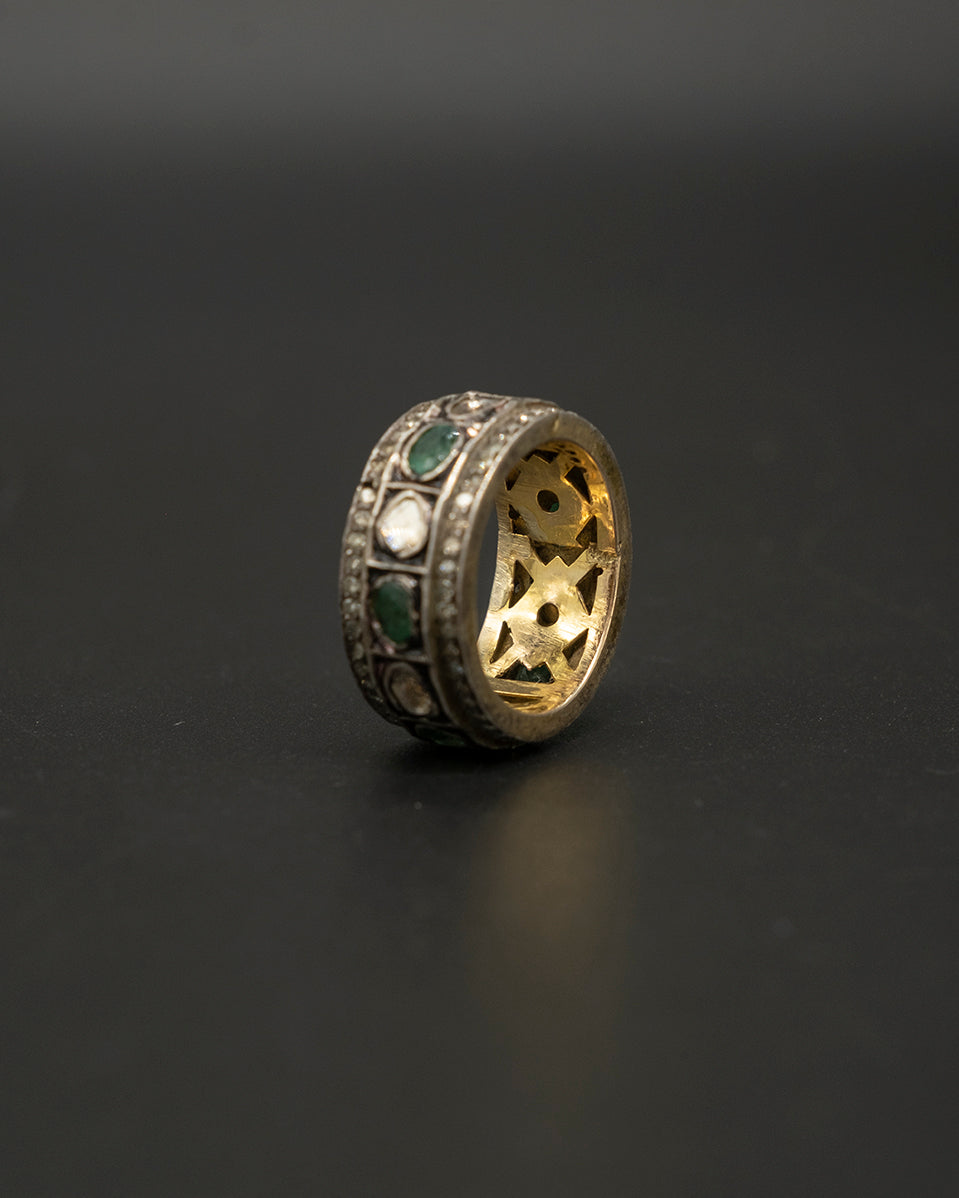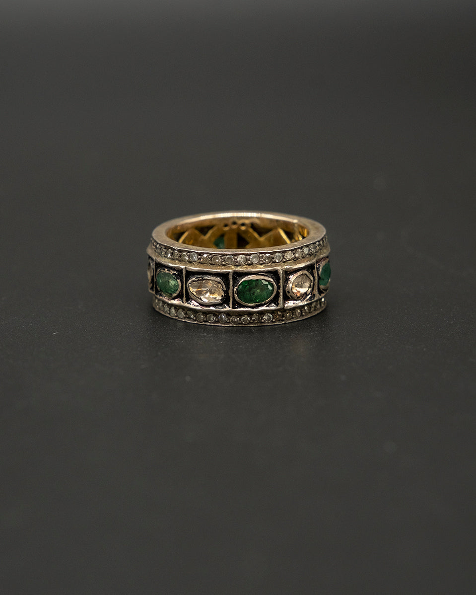 A rich green emerald accented with sparkling diamonds, set in hand-textured silver. The vibrant emerald and shimmering diamonds create a harmonious balance of elegance and boldness, making a timeless, refined statement piece.