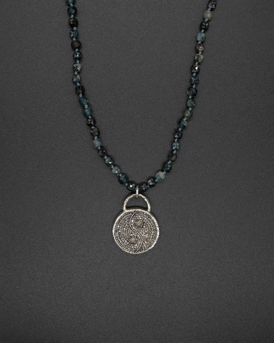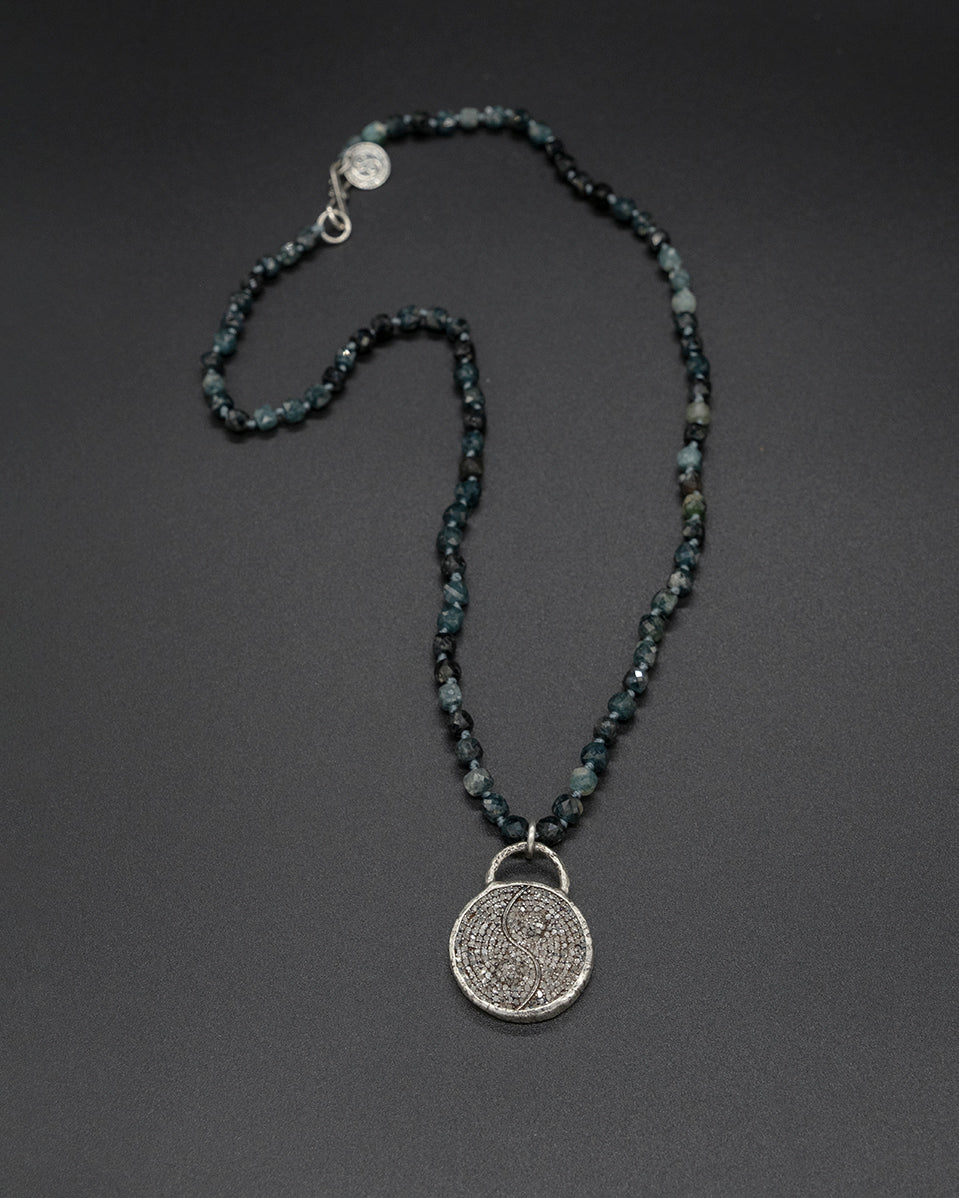 Embrace the complementary forces of life with our diamond and silver yin yang pendant. This piece symbolizes the profound philosophy of balance and harmony. The pendant is perfectly matched with a hand-knotted blue tourmaline chain, enhancing its shine.