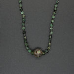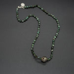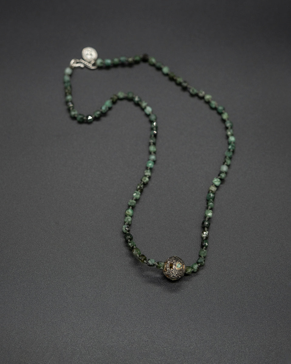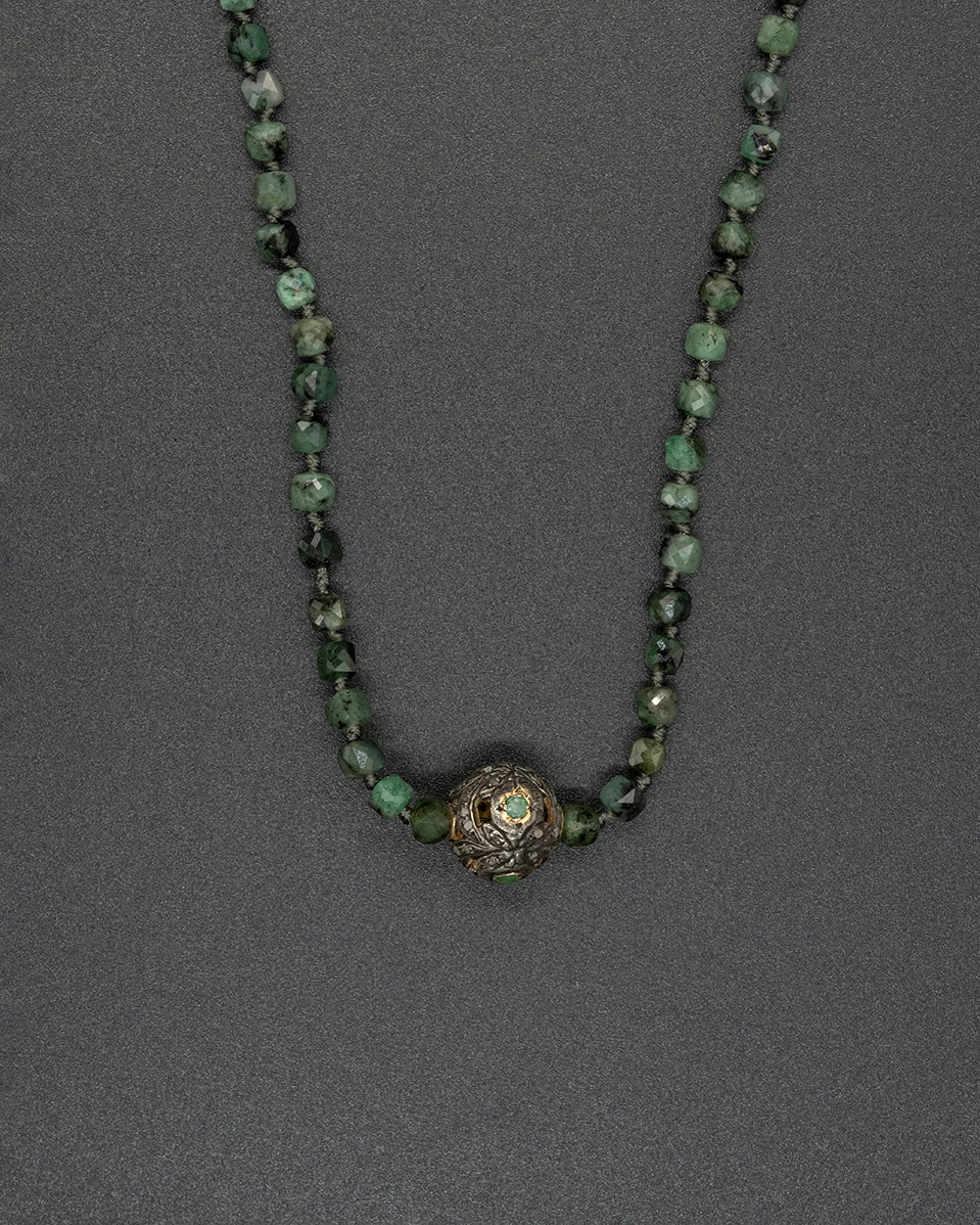 This enchanting piece showcases a vintage diamond and emerald accented bead. The centerpiece is paired with a hand-knotted emerald chain.
