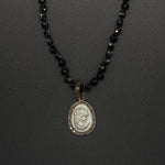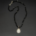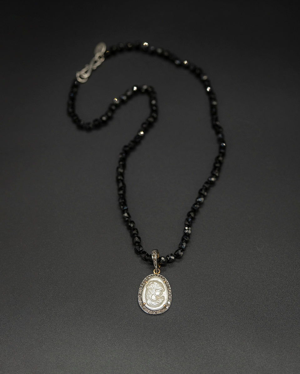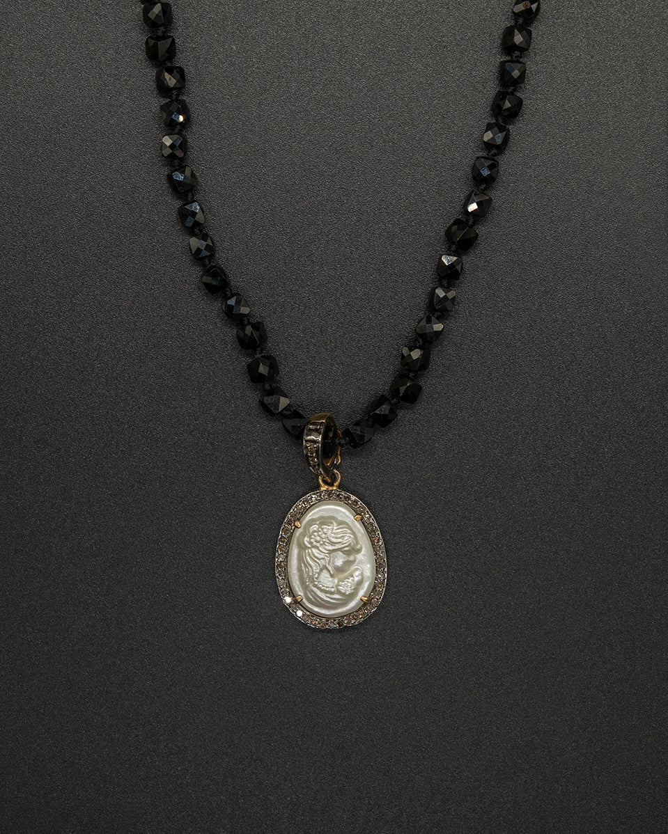 A delicate piece featuring a hand-carved shell pendant, paired with the subtle sparkle of diamond-cut spinel beads. Light, organic, and refined—perfect for adding a soft natural charm with a touch of midnight shimmer.