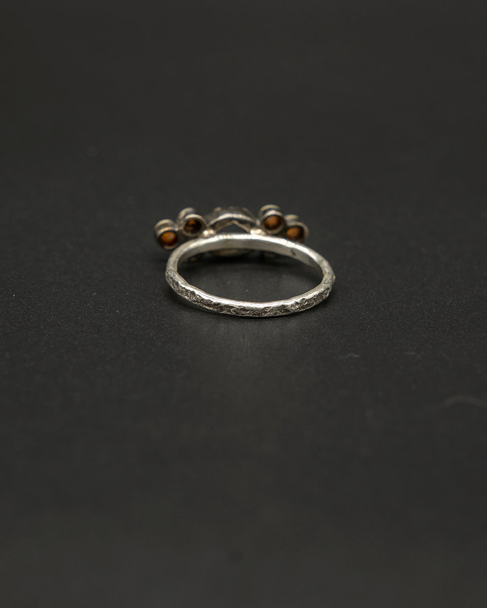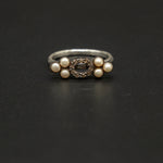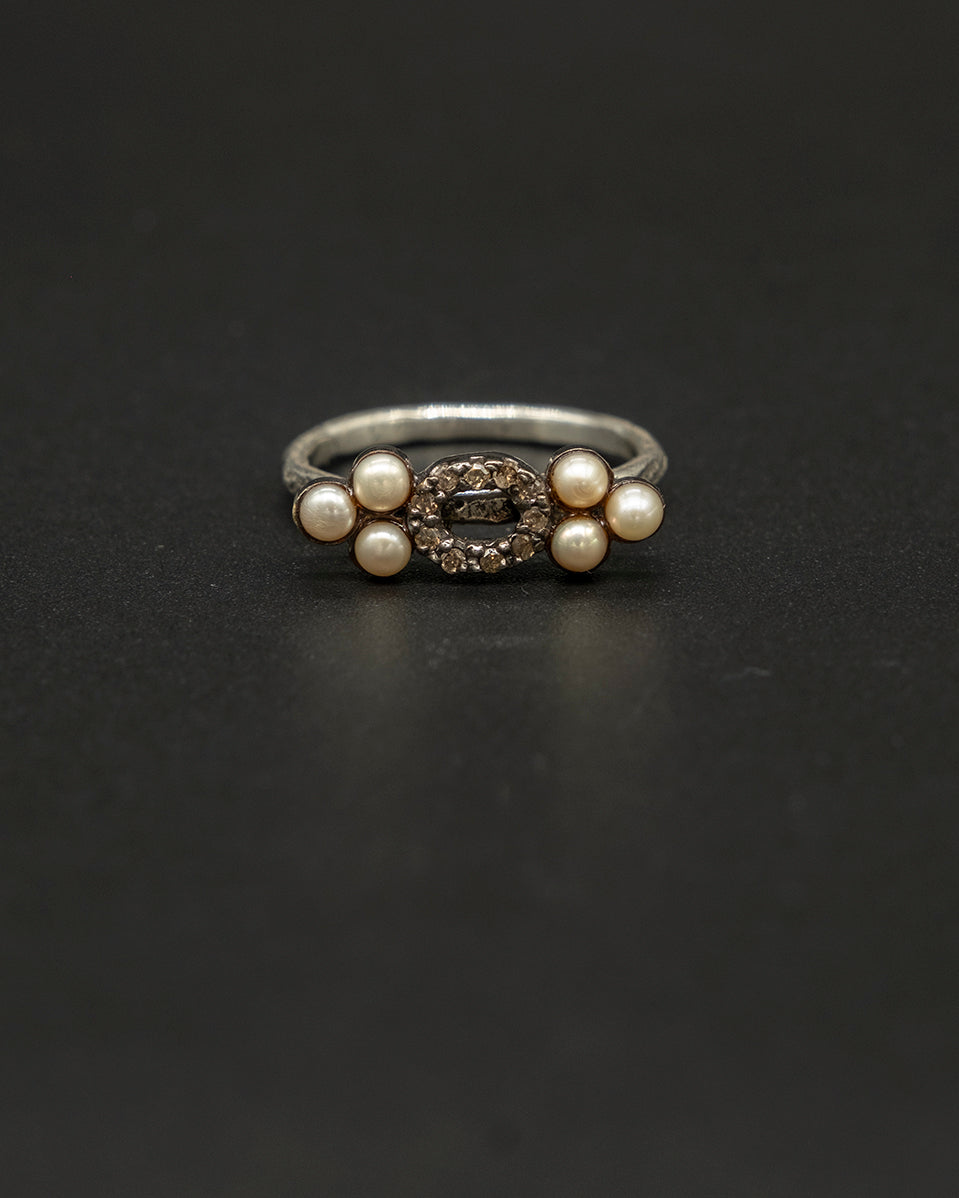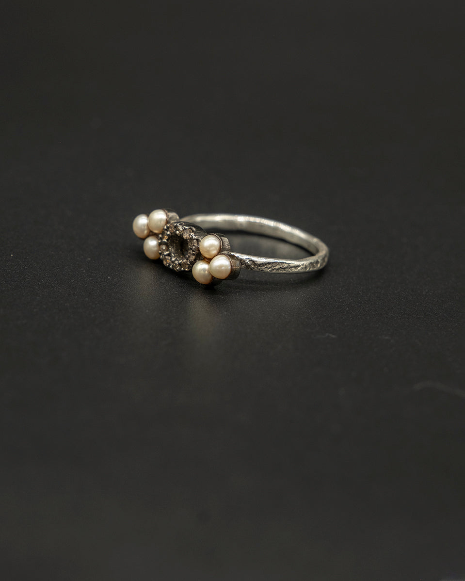 A lustrous South Sea pearl paired with sparkling diamonds, set in hand-textured silver. The soft glow of the pearl contrasts beautifully with the diamonds’ sparkle, creating a timeless, elegant ring full of classic sophistication and subtle luxury.