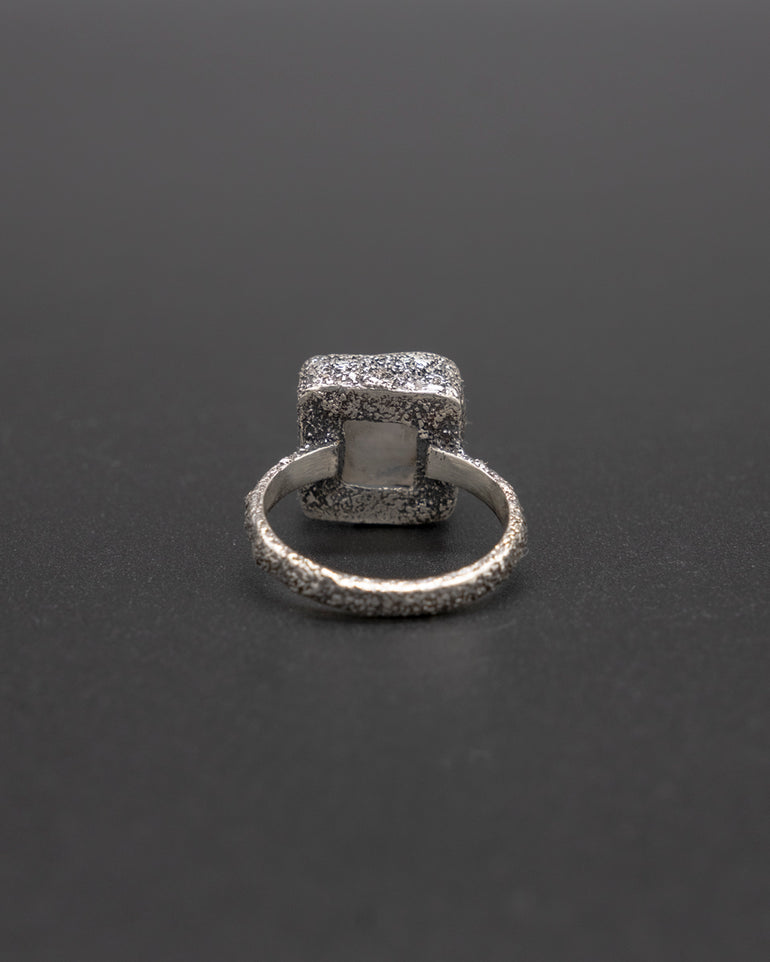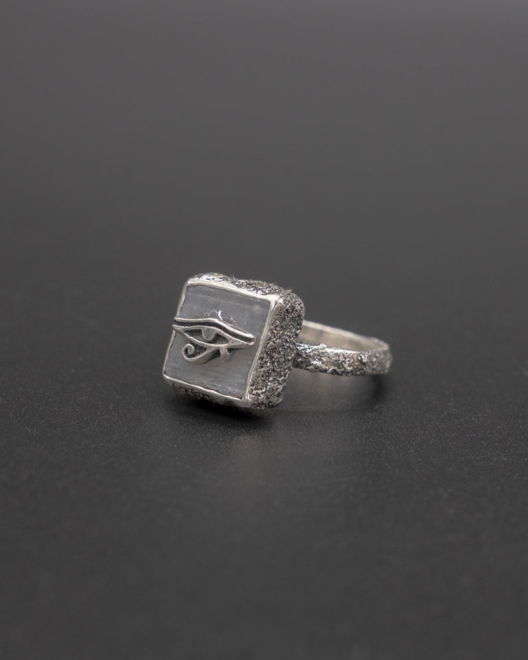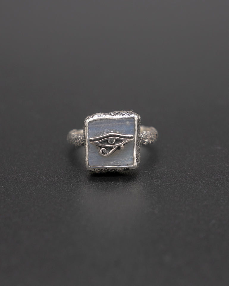 Inspired by the mythical eye of Ra, this ring features a raw-cut moonstone and a textured sterling silver band that catches the light at every angle. The stone's natural iridescence highlights the eye of Ra symbol, reminding you of your inner strength and power.