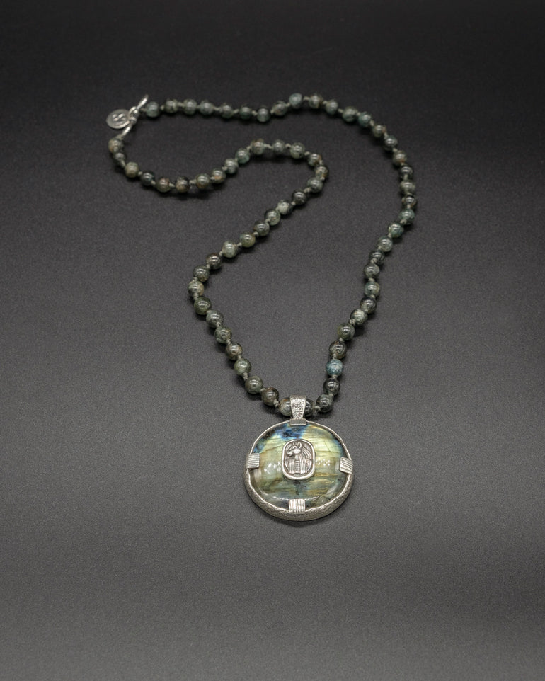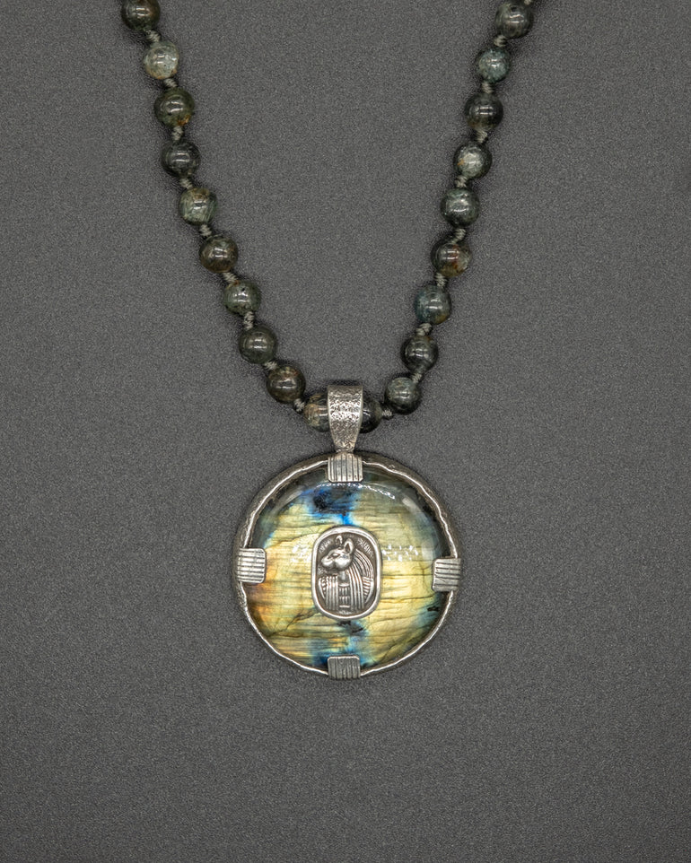 Channel mystical elegance with this Labradorite Silver Bastet Pendant, featuring a finely textured silver frame inspired by the Egyptian goddess of protection. The pendant is paired with a hand-knotted green kyanite chain, blending spiritual energy and artisanal design. Labradorite enhances intuition and transformation, while green kyanite brings balance and calm — a powerful union of beauty, strength, and grace.