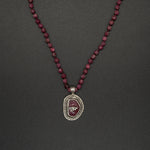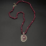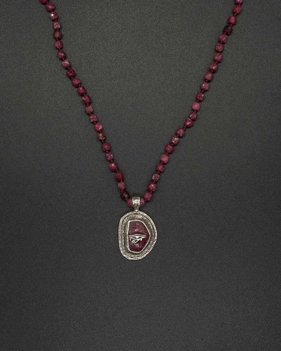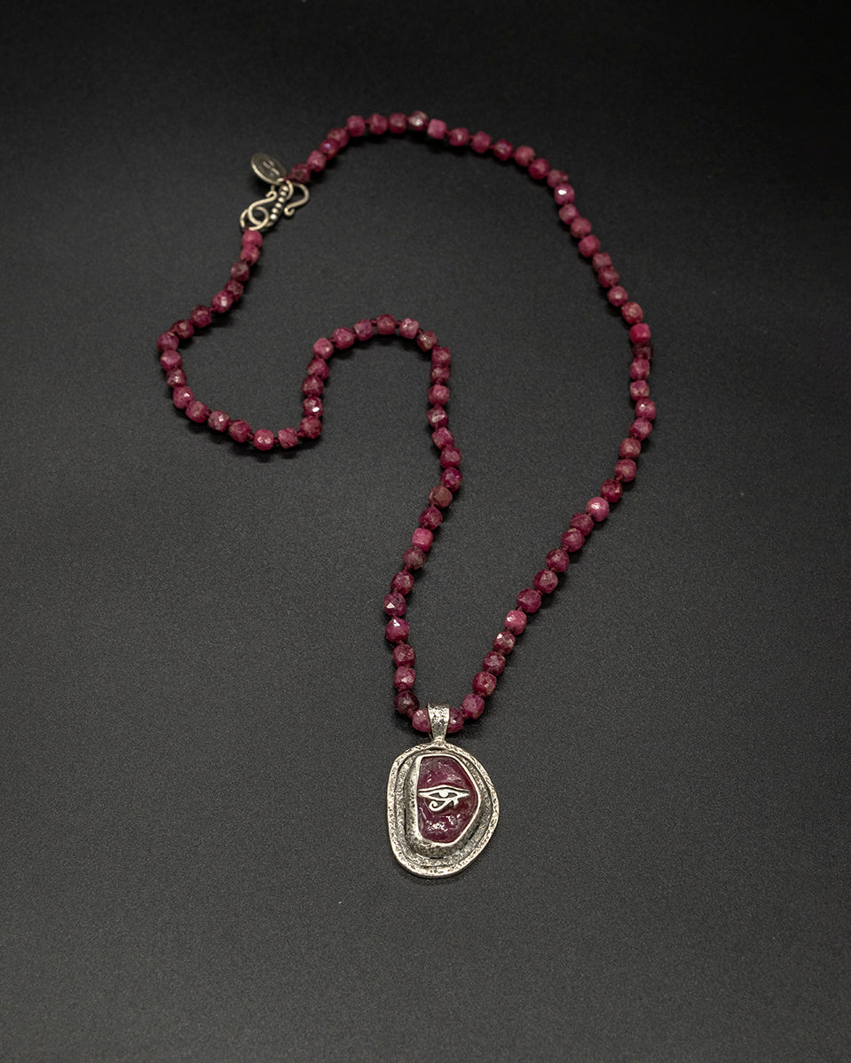 This handmade sterling silver & raw-cut ruby pendant featuring a silver eye of Ra. Paired with the hand-knotted ruby chain this piece exuberates strength, power, and peace of mind. Ruby is considered the stone of nobility, and it is believed to bring its wearer strength, power, and peace of mind. The eye of Ra symbol represents strength, intensity, and protection. Let the ancient energy of the Eye of Ra guide you on your journey.