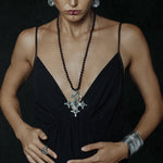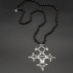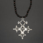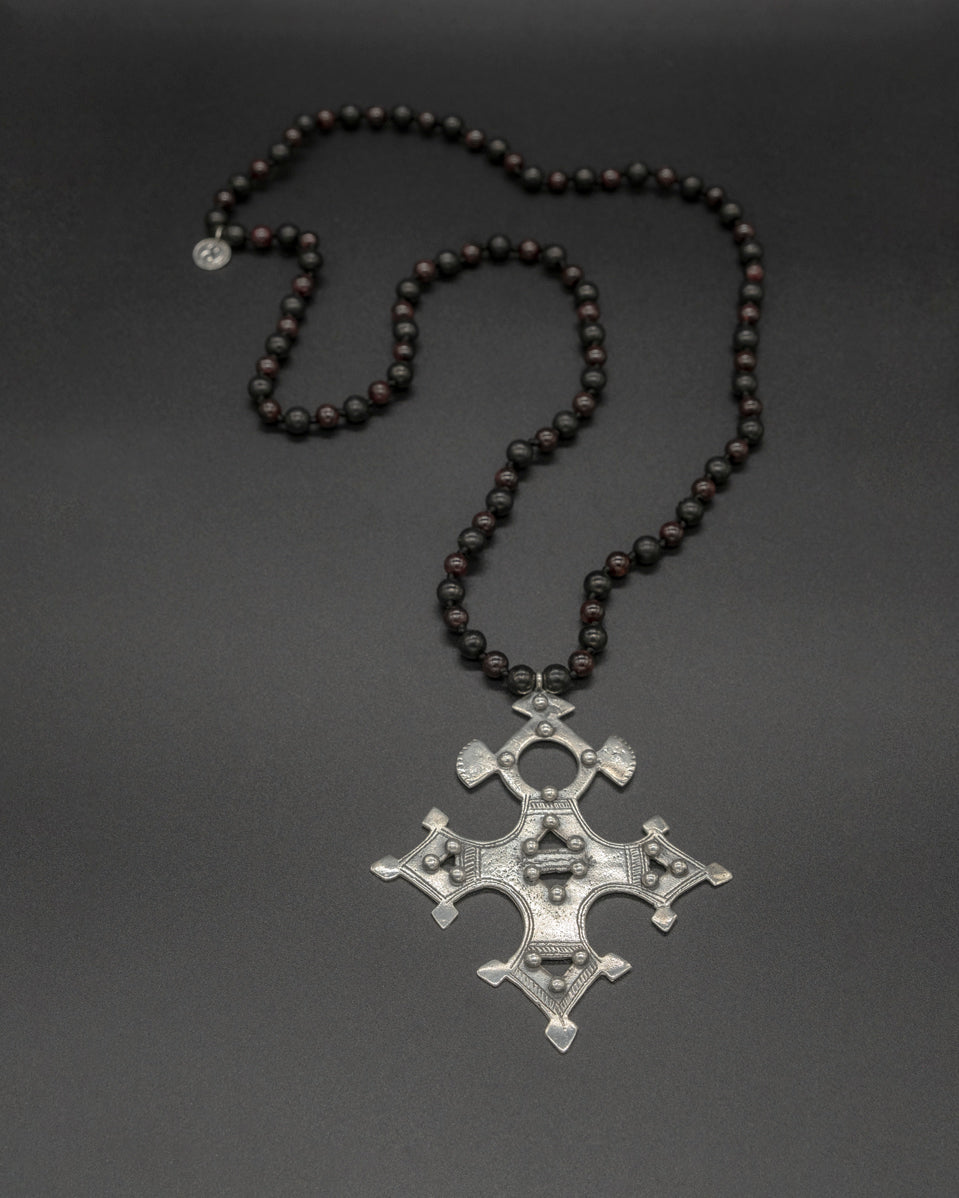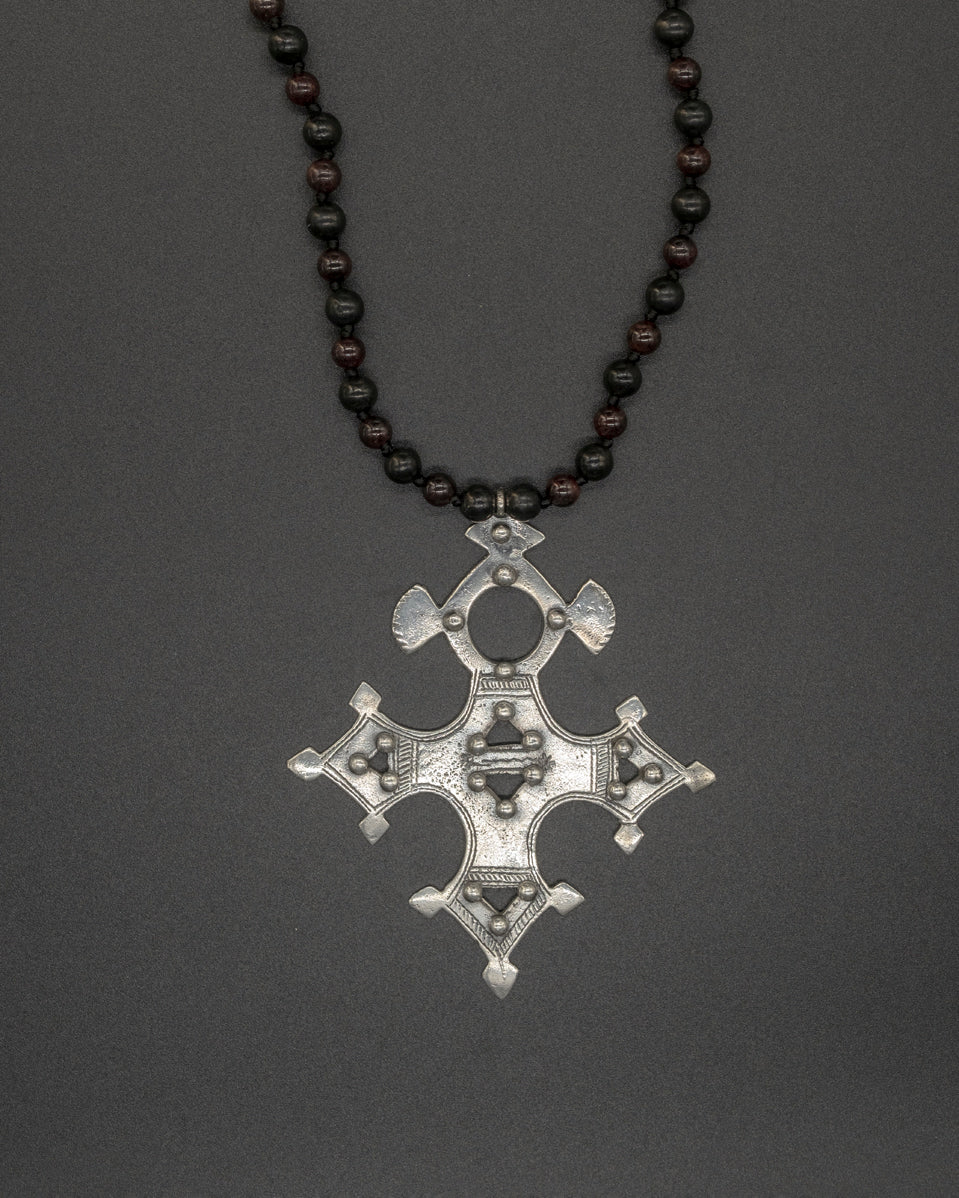 This unique pendant captures the essence of the traditional Tuareg design. Nomads of the desert, the Tuareg inhabit a vast territory spanning from the Moroccan Saharan desert to Burkina Faso in the south. This silver Nigerian Tuareg Bartchakea cross is paired with a hand-knotted shungite and garnet chain.