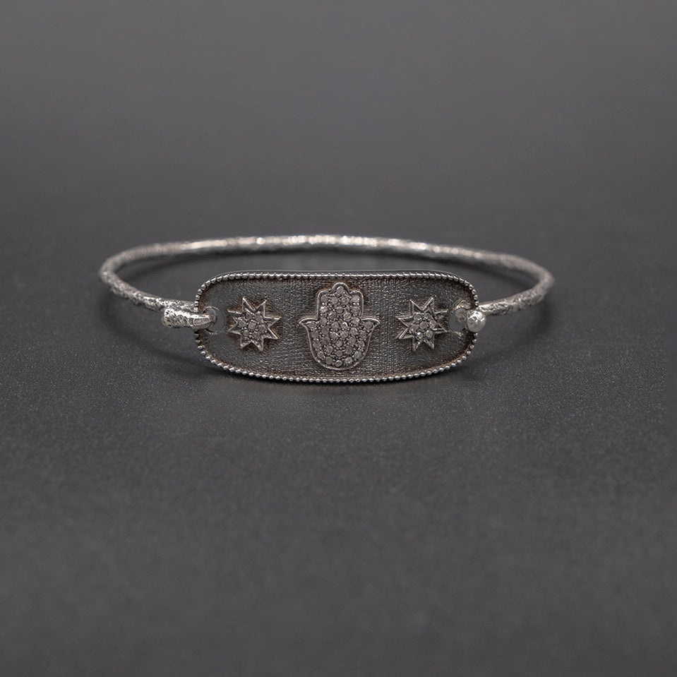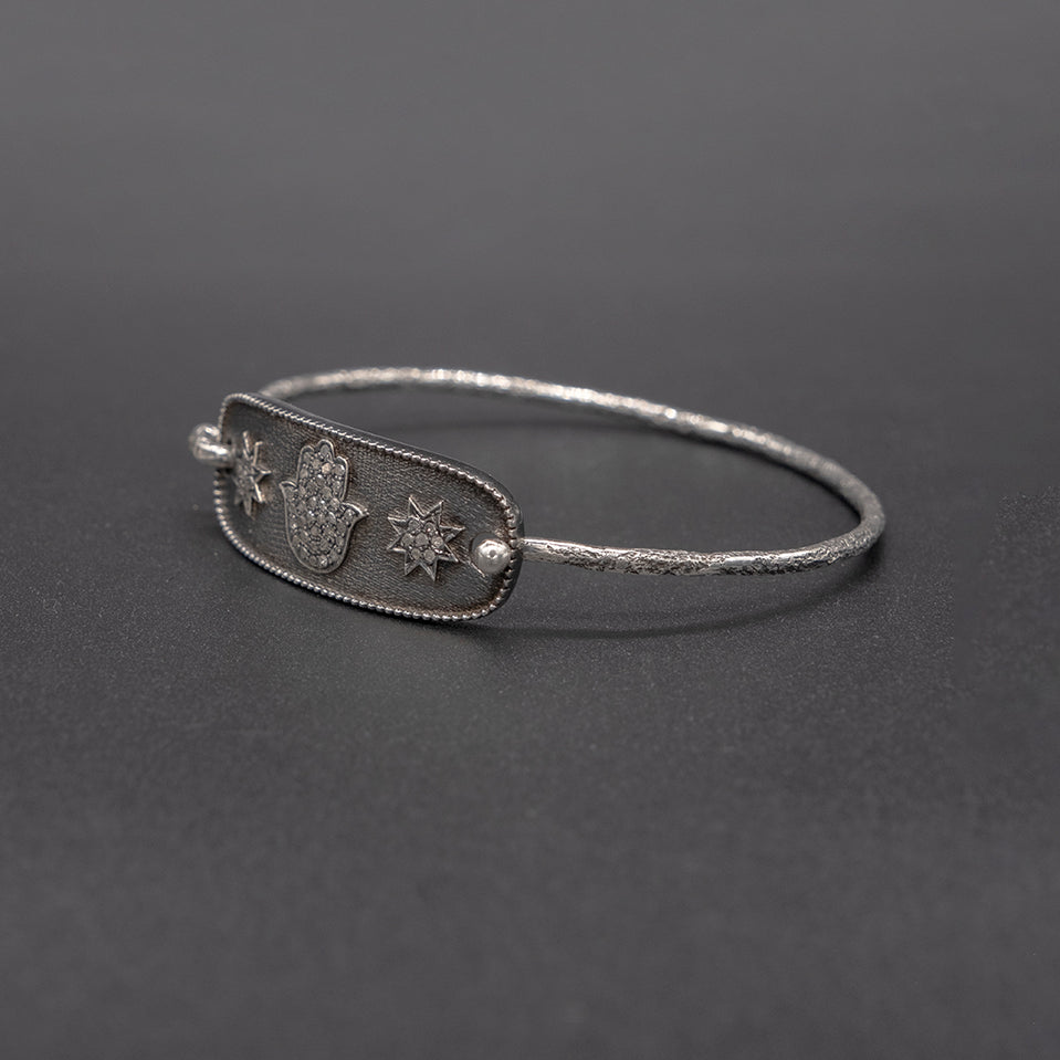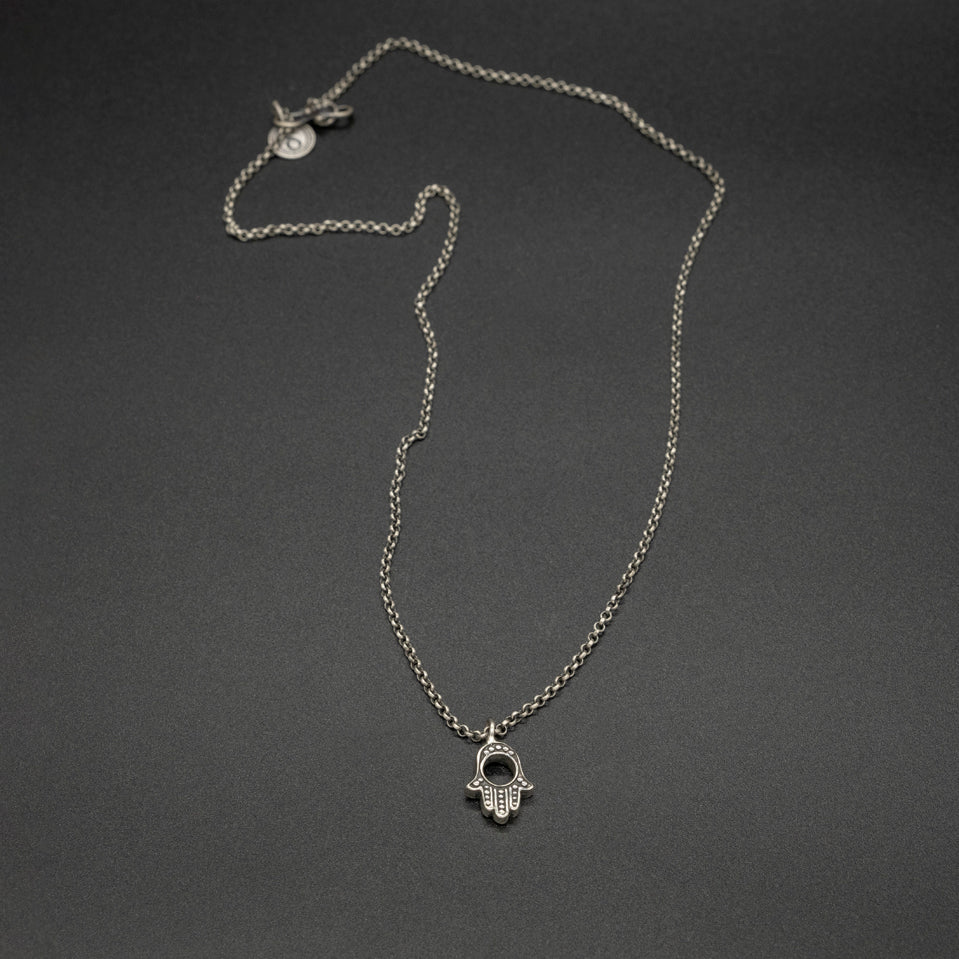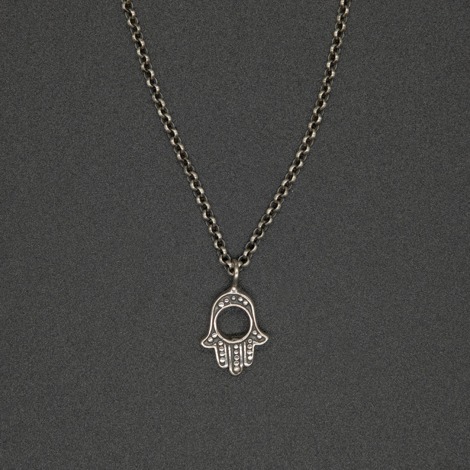 The hamsa is a protective emblem that is linked to good fortune, luck, health, and happiness as well as to warding off negativity and evil. It is referred to as "The Hand of Miriam" in Jewish tradition and "The Hand of Fatima" in Muslim tradition. In the Hamsa's symbol meaning, the hand's posture is significant. When the hand is pointing downward, it symbolizes goodness and abundance and is a positive omen that things will become better in your life. A hand raised in the air symbolizes protection and deflects negativity toward oneself and others.