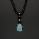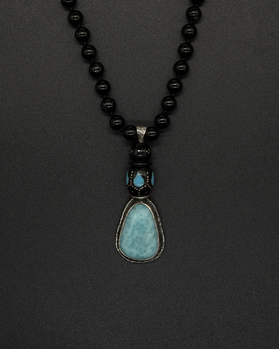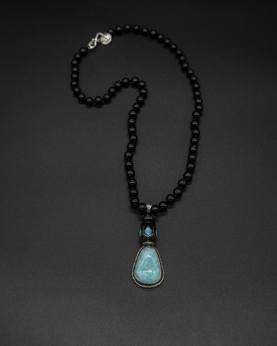 This necklace features a stunning larimar stone pendant elegantly framed in silver and capped with a vintage blue bead. The striking contrast of the black tourmaline chain adds a touch of sophistication, while the larimar is believed to enhance communication with all living things, connecting you deeply to the essence of Mother Nature and the serene beauty of the sea.