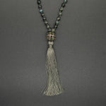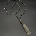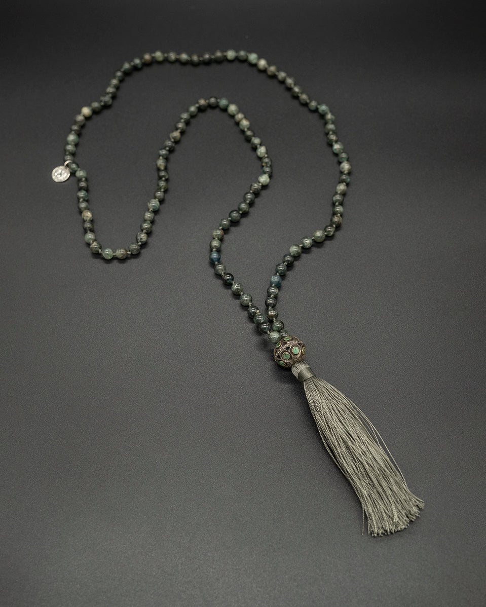 Diamond Emerald Guru Bead paired with a 108 Green Kyanite chain — a radiant creation that embodies wisdom, renewal, and balance. The shimmering diamonds and emeralds bring clarity and heart energy, while the soothing green kyanite encourages harmony and spiritual alignment.