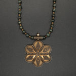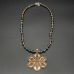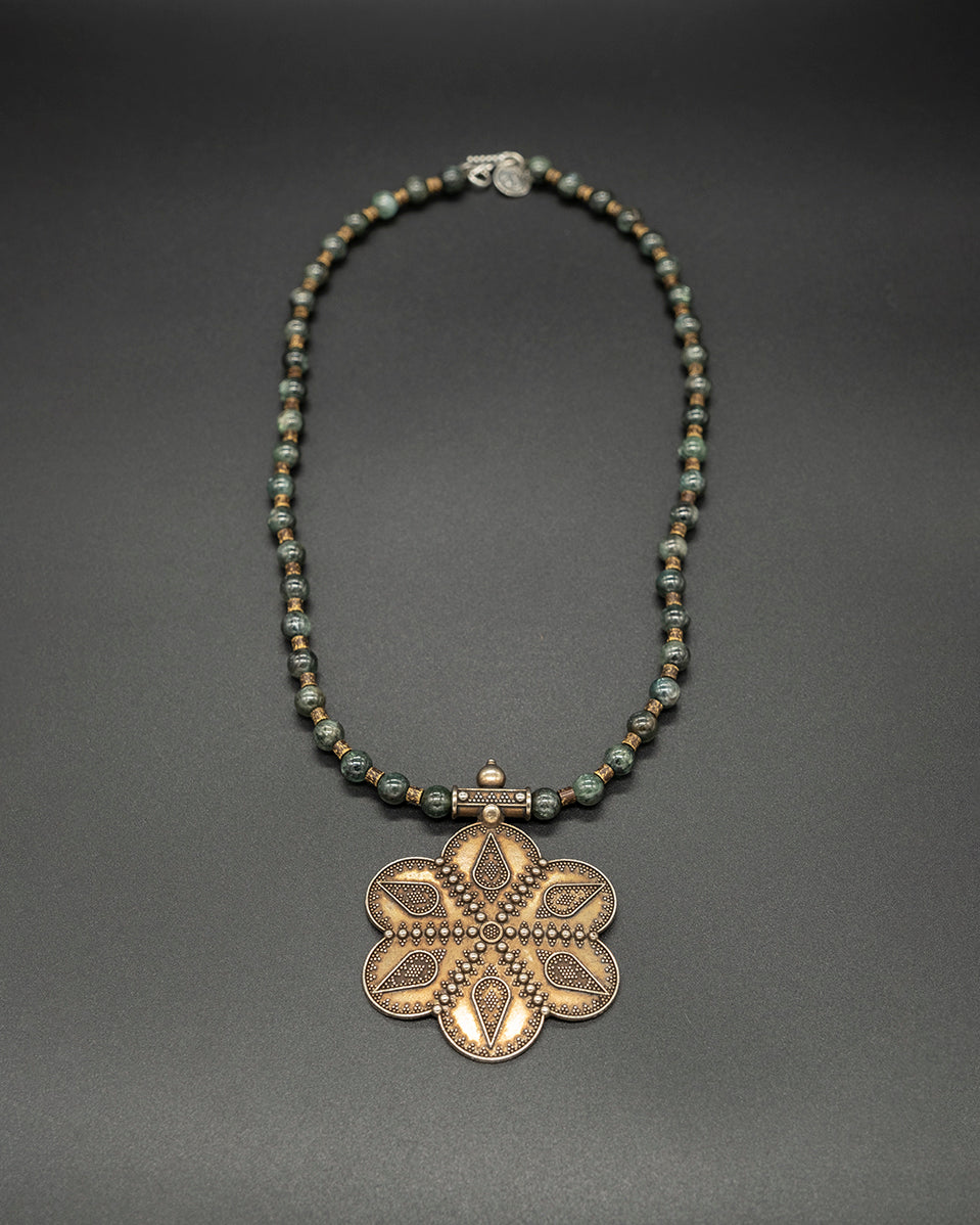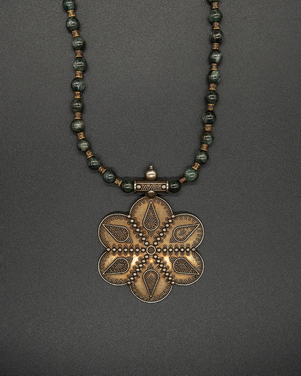 Crafted with a vintage brass pendant with a warm floral design and a hand knotted kyanite chain, this golden flower necklace is full of warmth.