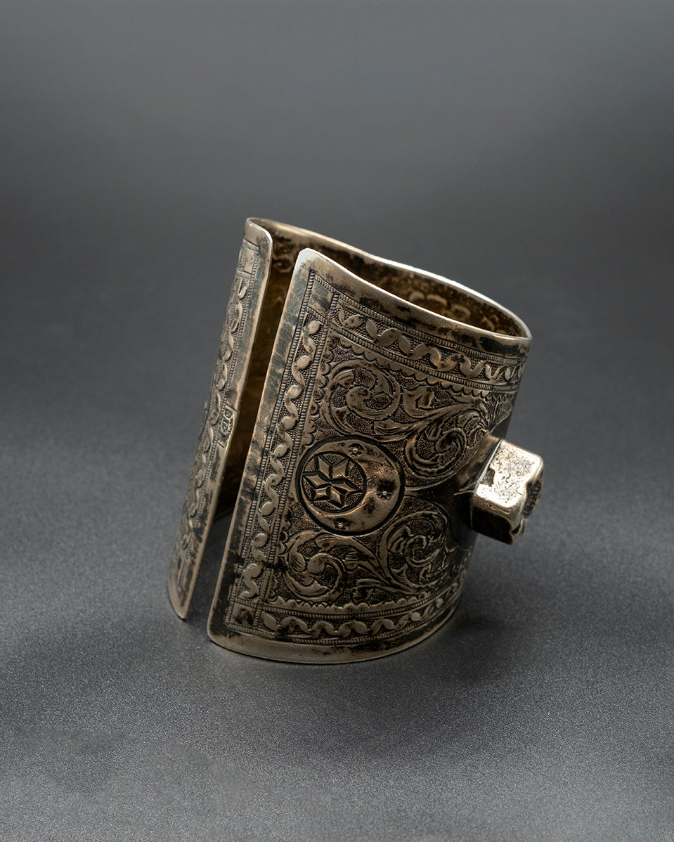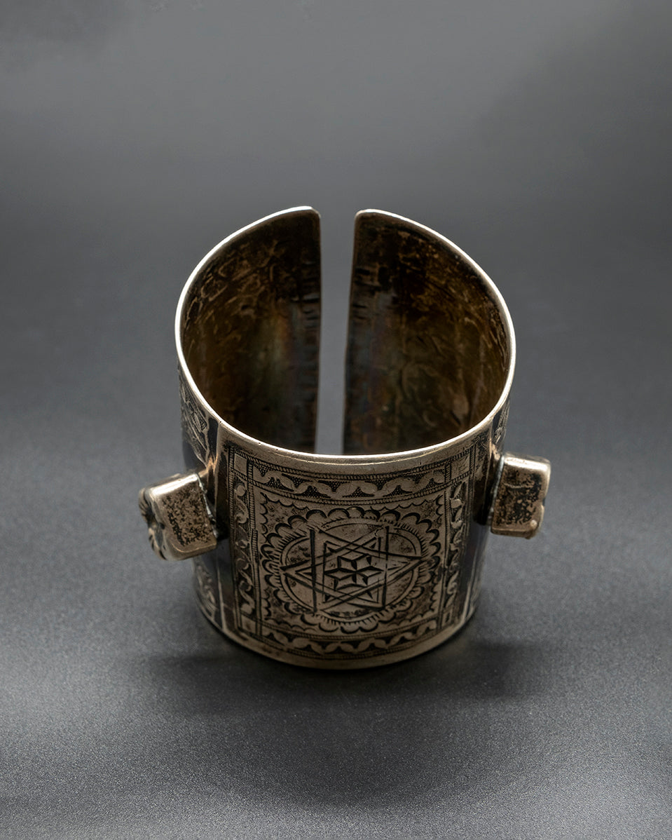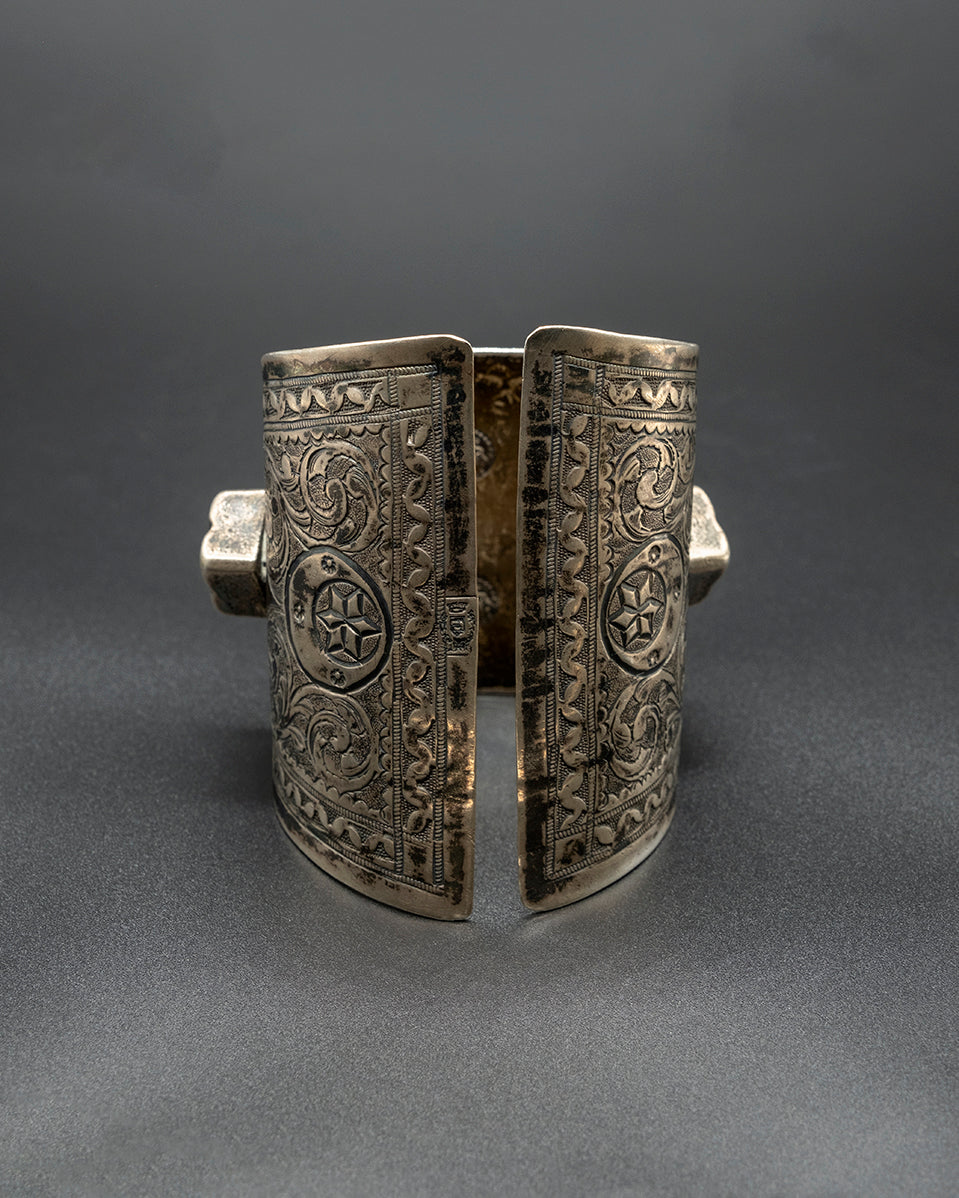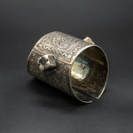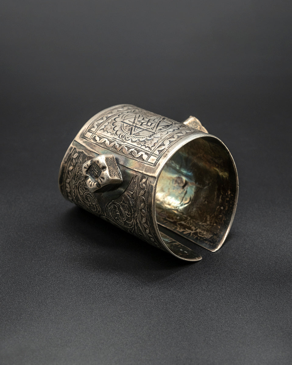 Make a statement with our exquisite Libya Cuff, a true testament to the unparalleled beauty of traditional tribal jewelry. Meticulously crafted from high-quality sterling silver and featuring intricate hand-carved detailing, this vintage cuff from Libya is a true work of art. 217 grams of silver