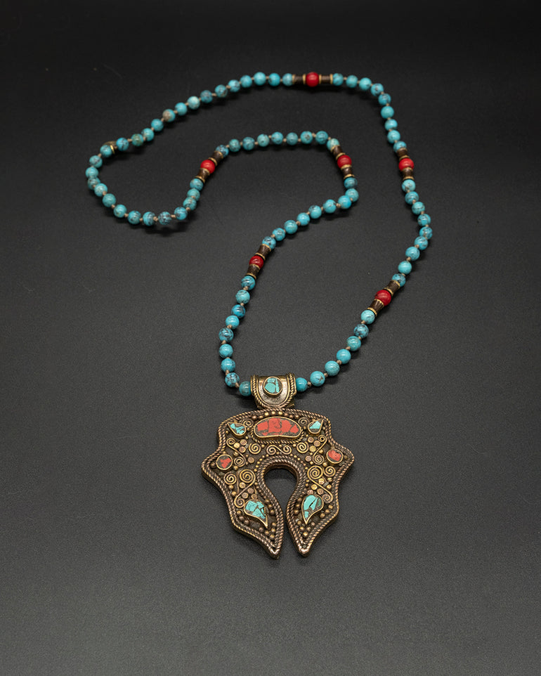 This vintage Nepalese brass pendant is intricately designed with coral and turquoise accents, making it truly one-of-a-kind. It is paired with a gorgeous hand-knotted turquoise, coral, & brass chain.