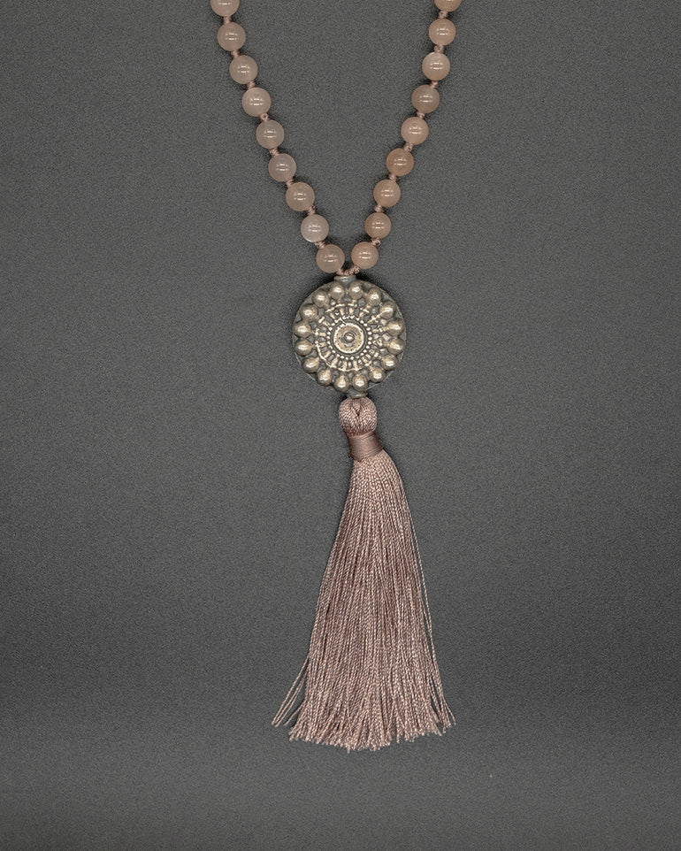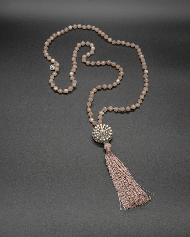 Adorned with 108 peach moonstone beads and a silver Indian guru bead, this mala embodies feminine energy, intuition, and emotional balance. The gentle shimmer of moonstone reflects tranquility and inner harmony, while the silver guru bead adds a touch of sacred elegance — a perfect companion for meditation or everyday serenity.