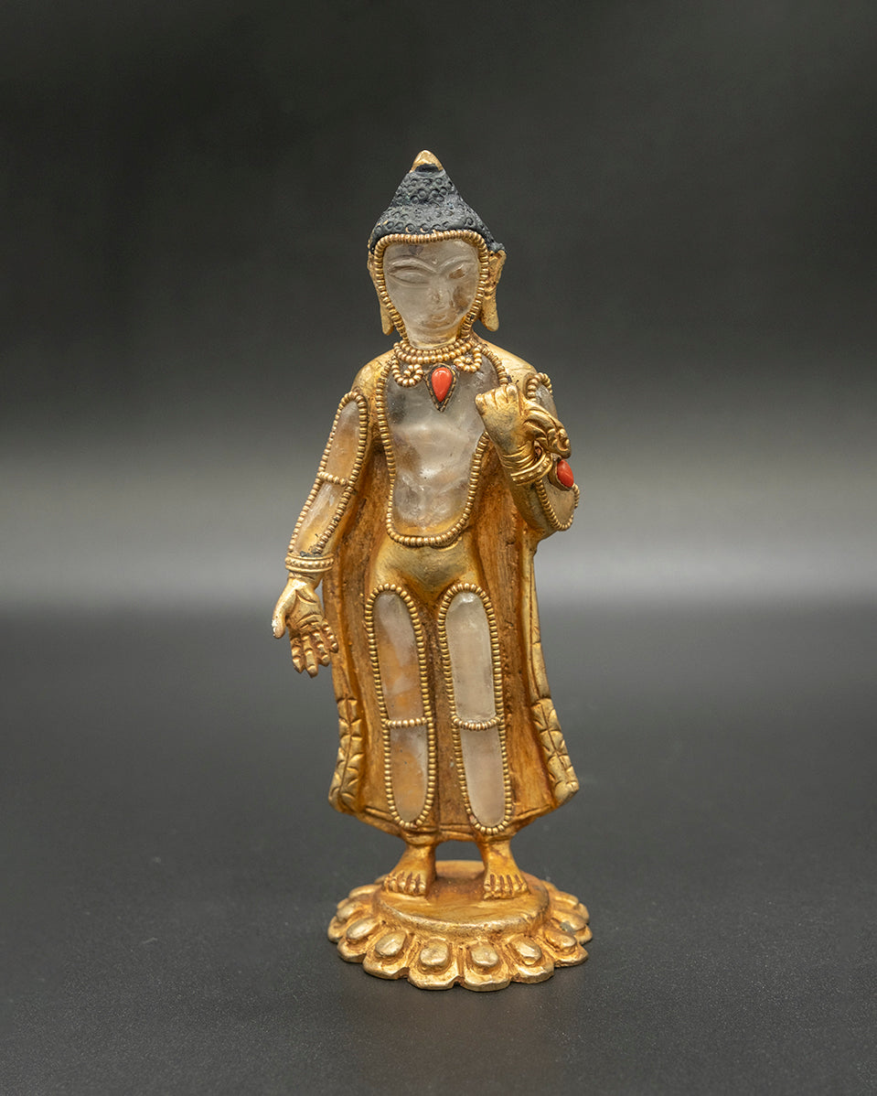 Add a sense of tranquility to your surroundings with this inspiring Buddha statue, beautifully crafted with carved quartz crystal and accented with brass and coral. Let The Buddha's art encourage you to embrace your full potential and discover the profound wisdom that lies within you.