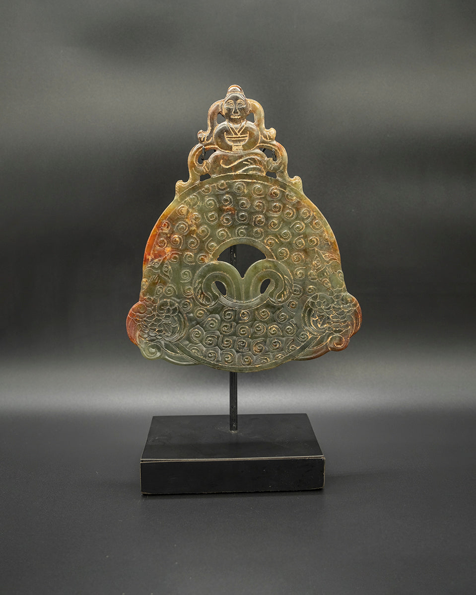 This stunning Mongolian Jade center piece is a true work of art. Featuring intricately carved jade, this elegant piece is sure to make a statement in any room. The included base adds a finishing touch, making it perfect for display on a shelf or table.