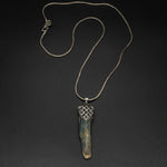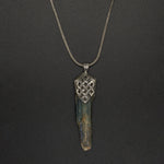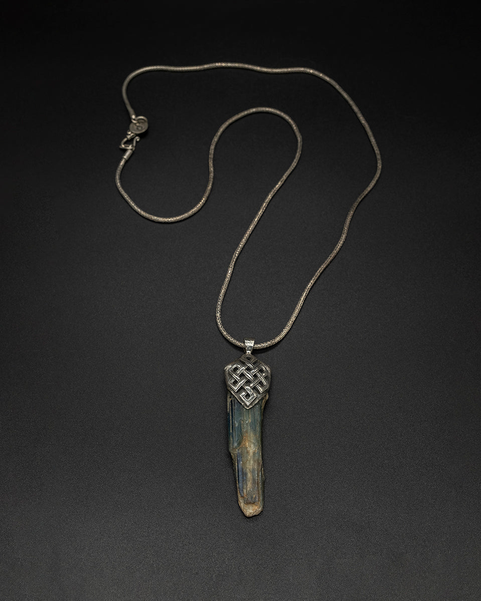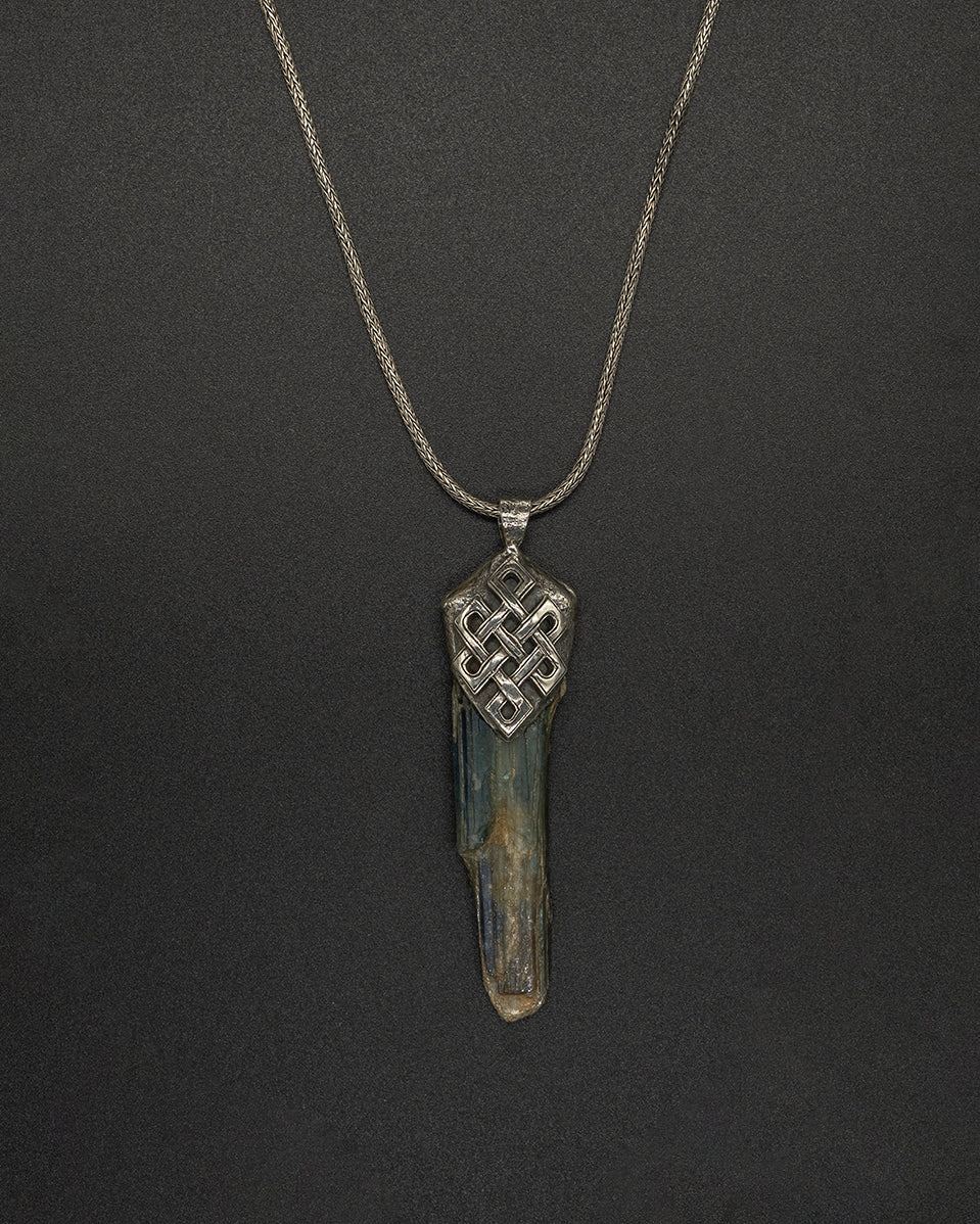 A graceful piece featuring luminous kyanite set in sterling silver with an endless knot symbol. Finished with a sleek silver snake chain, it embodies harmony, clarity, and timeless elegance.