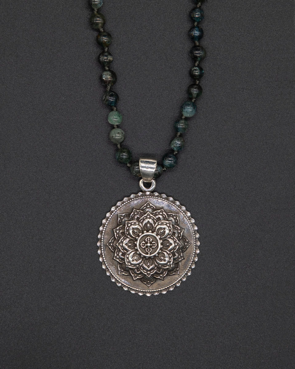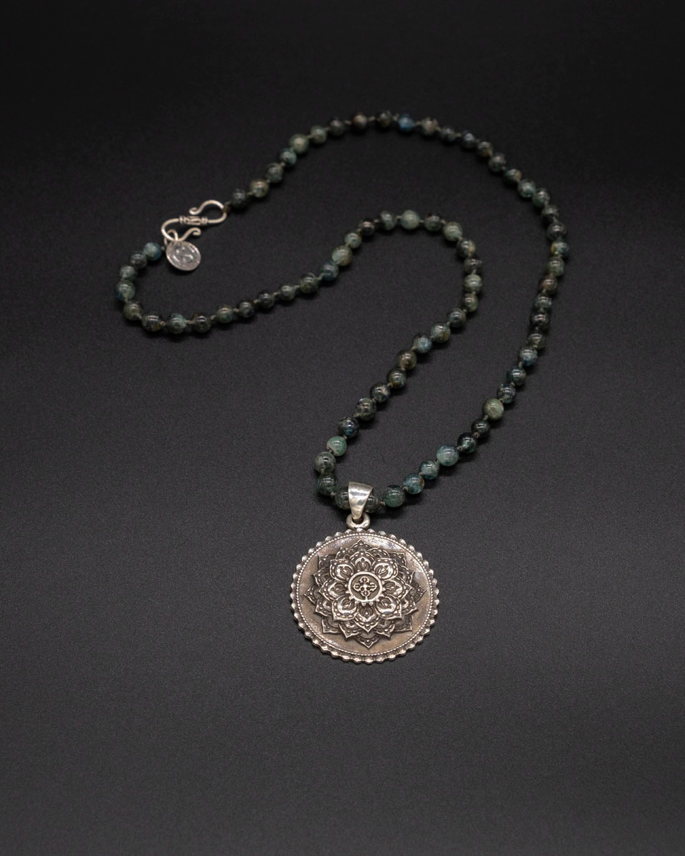 This silver vintage Tibetan Padma amulet evokes a feeling of an ancient culture, coupled with a modern edge! It is masterfully crafted with a hand-knotted kyanite chain.