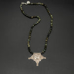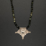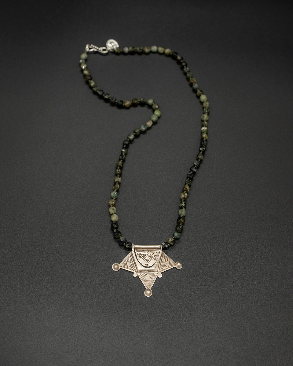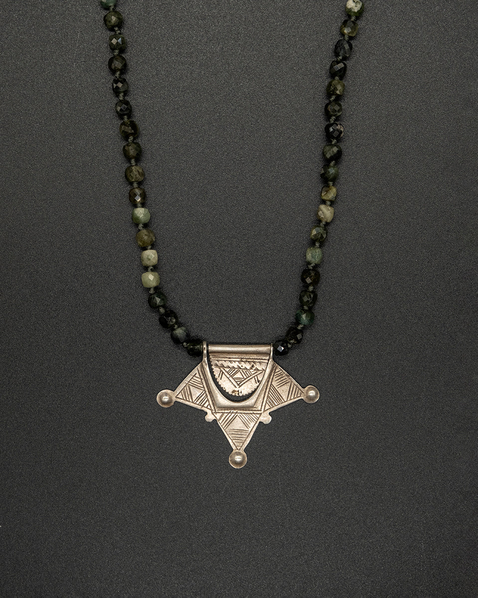 This unique pendant features a silver Tuareg pendant. Nomads of the desert, the Tuareg inhabit a vast territory spanning from the Moroccan Saharan desert to Burkina Faso in the south. This silver pendant is paired with a hand-knotted green kyanite chain.