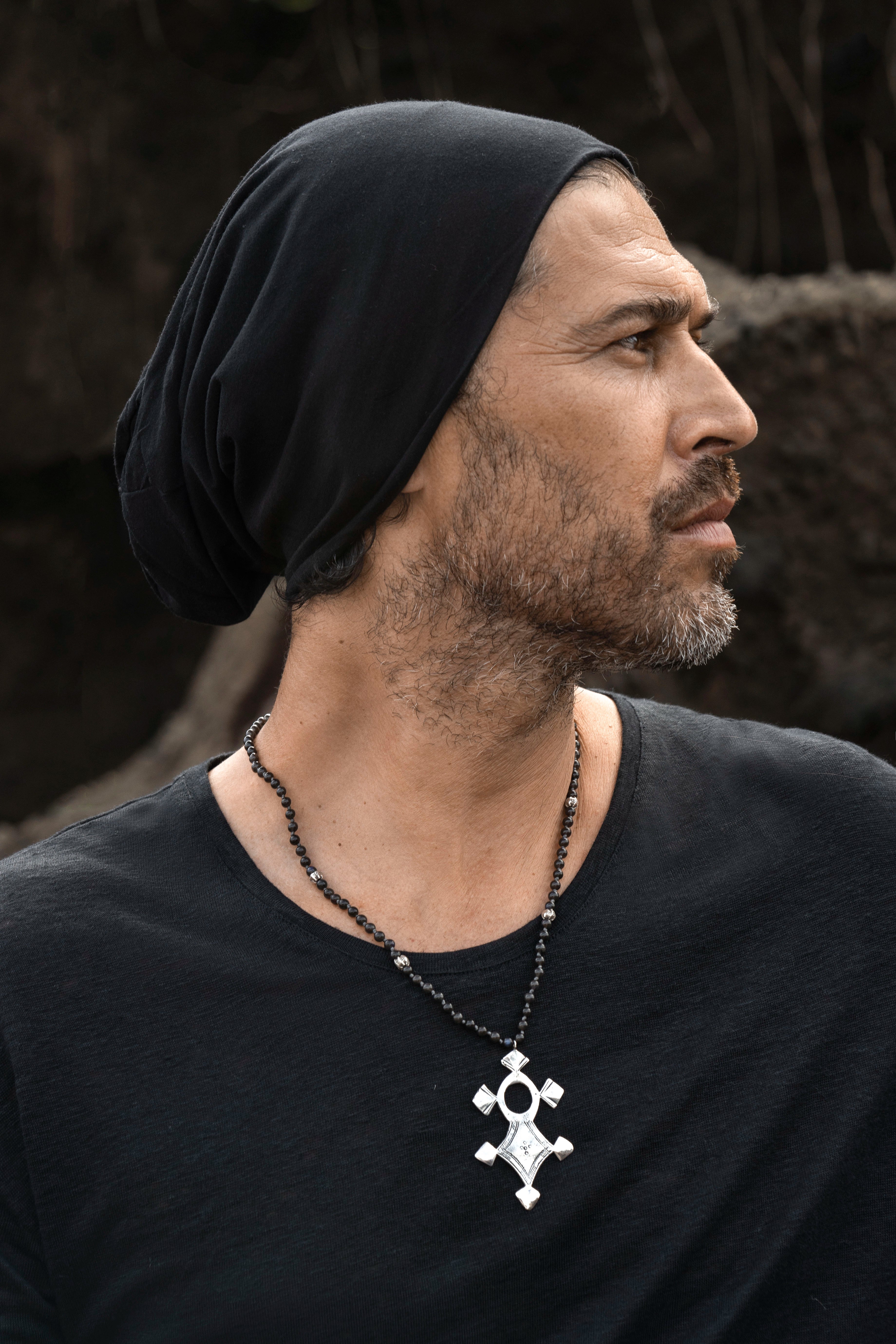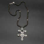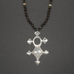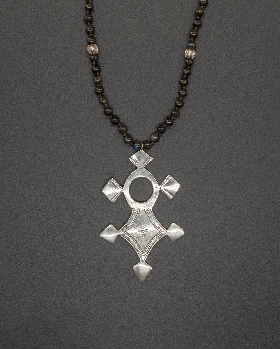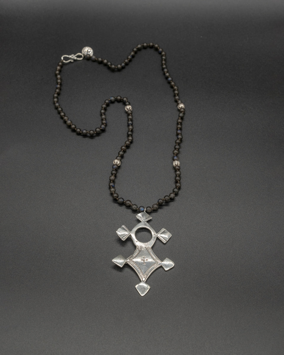 This unique pendant captures the essence of the traditional Tuareg design. Nomads of the desert, the Tuareg inhabit a vast territory spanning from the Moroccan Saharan desert to Burkina Faso in the south. This silver Nigerian Inarangnak Cross hangs on a hand-knotted star labradorite and silver accented chain.