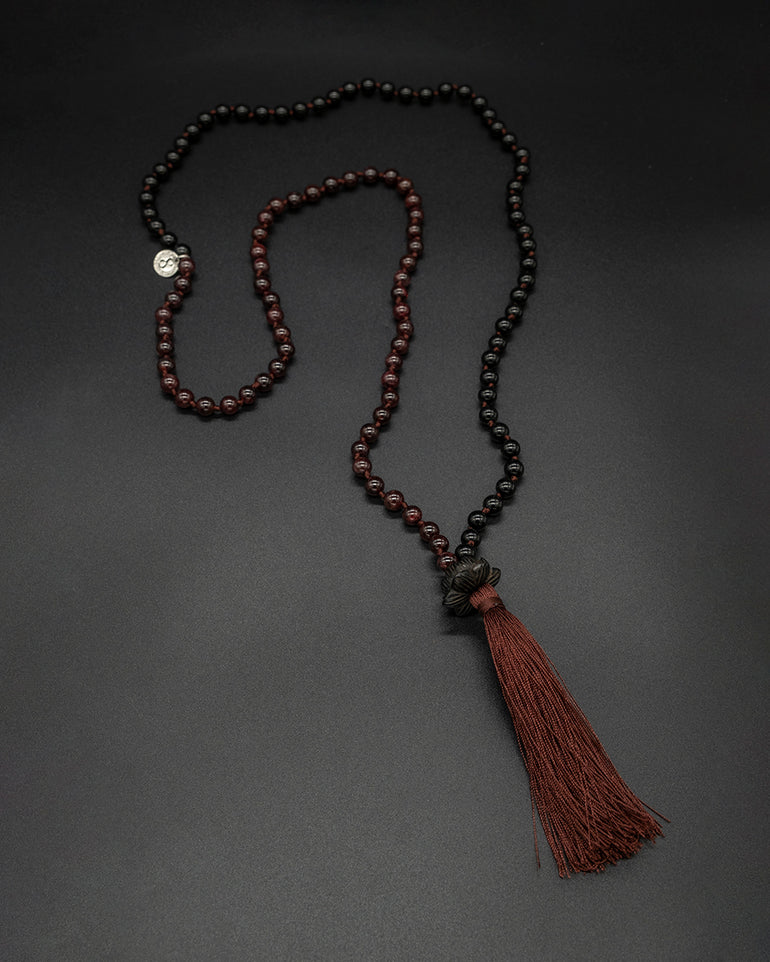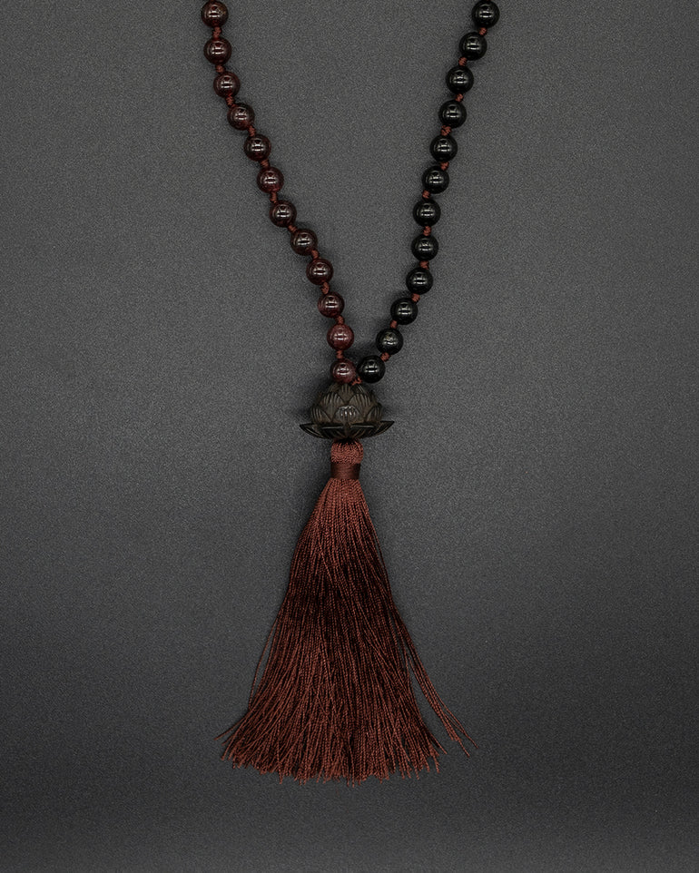 Featuring a black Ebony wood hand-carved Lotus, this unique guru bead is designed to guide your mindfulness practice as the lotus flower represents the journey toward enlightenment. Surrounding the guru bead are 108 perfectly sized black tourmaline and garnet beads, forming a mala that's deeply comforting to hold. Crafted with love and attention to detail, this mala is a remarkable work of art that will support your spiritual journey.