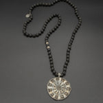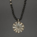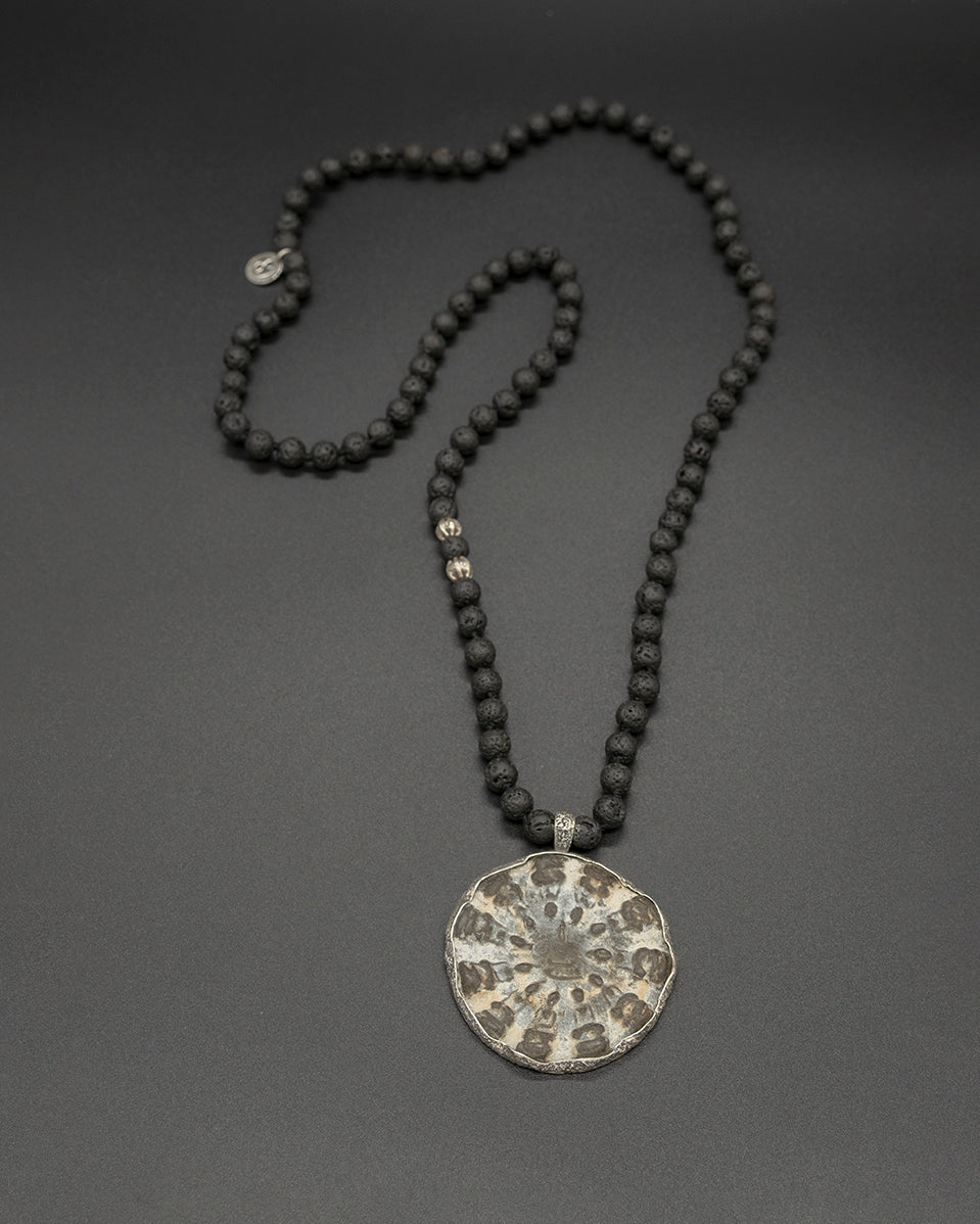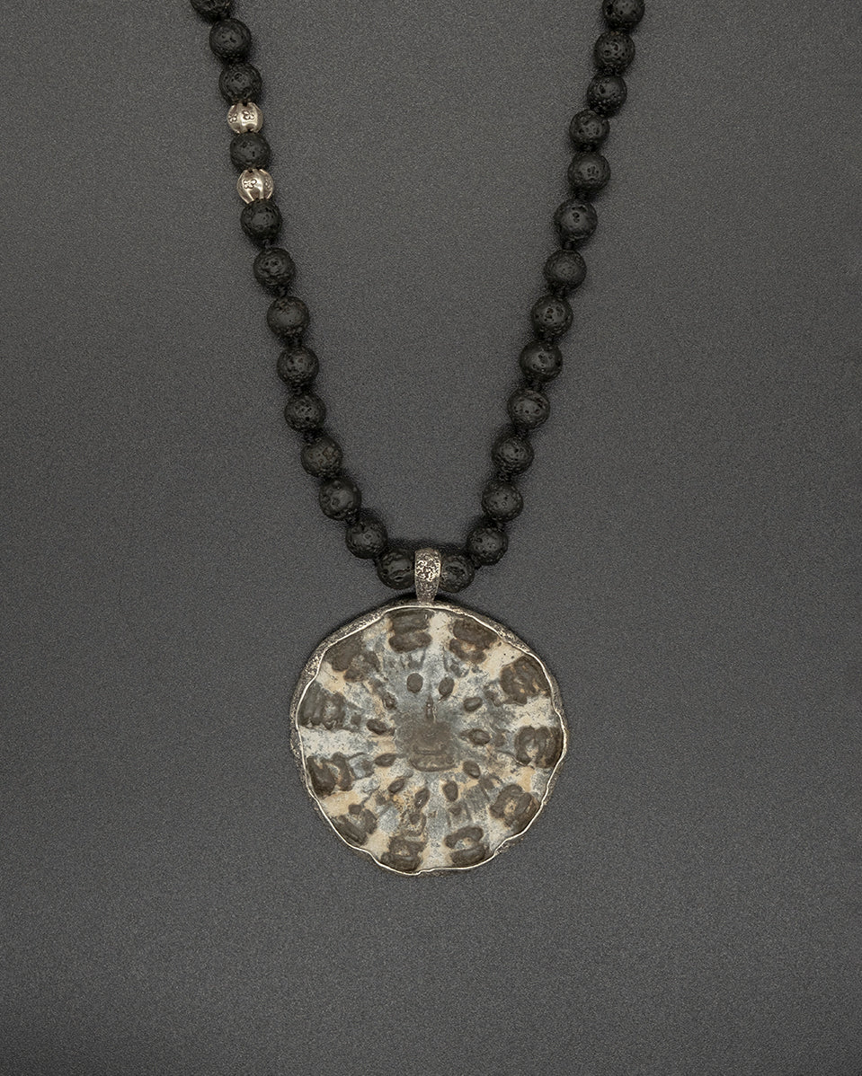 This vintage Tibetan clay karma wheel pendant is crafted with intricate detail and framed with hand-dusted sterling silver. This exquisite piece represents the eternal circle of life and death, allowing you to connect with your spiritual side. The lava stone and silver accented chain add a touch of contrast. The karma wheel is a constant reminder to stay true to your path and embrace the journey. Embrace your inner peace with this stunning masterpiece.