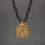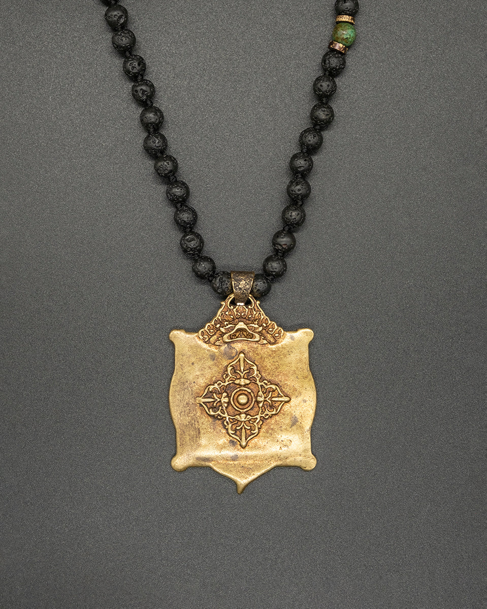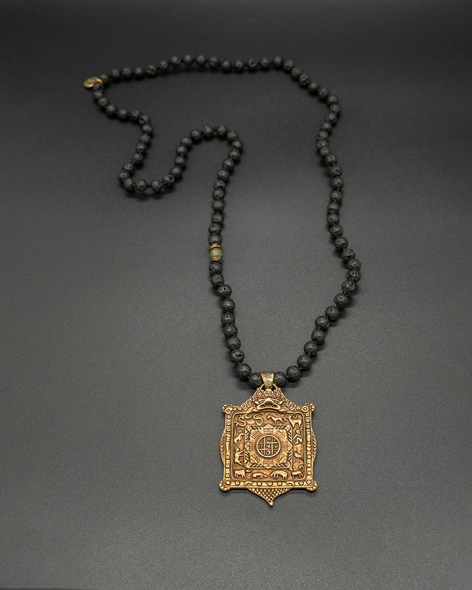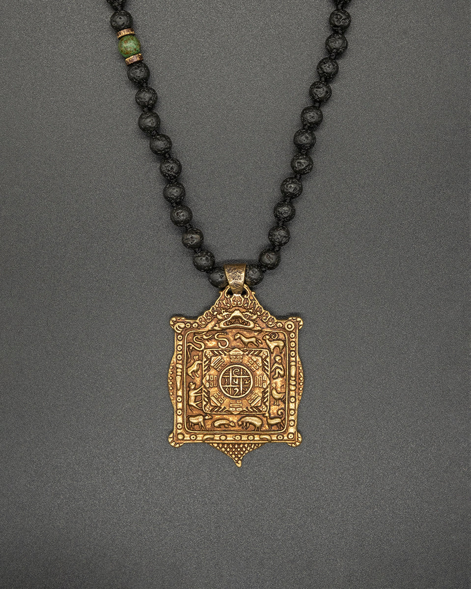 This vintage Tibetan brass zodiac pendant is unparalleled in detail and color. Hand-knotted black lava stone chain, accented with African turquoise & brass, pairs perfectly to enhance its antique appeal.
