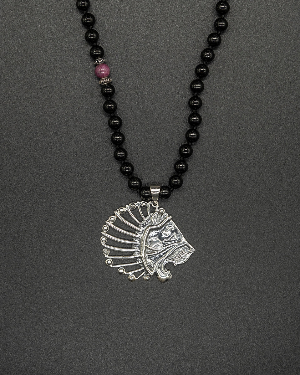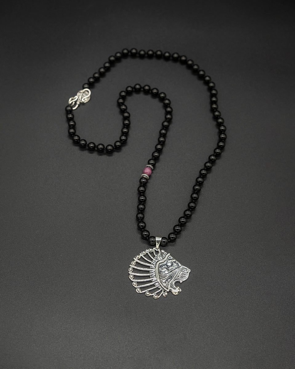 This necklace is designed for those who embody the spirit of Leo. This piece features a striking silver lion head pendant, symbolizing leadership and confidence, elegantly suspended from a black tourmaline chain. Accented with vibrant ruby and silver beads, this necklace serves as a powerful talisman for creativity and self-assurance.