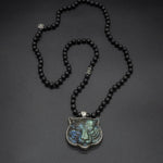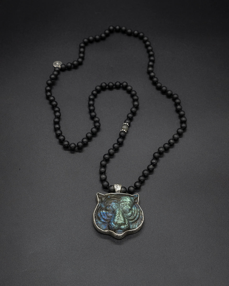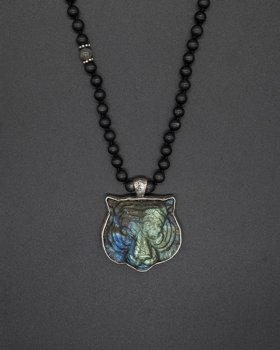 This pendant features a meticulously hand-carved labradorite tiger, showcasing its mesmerizing natural iridescence. The tiger's majestic allure is enhanced by its delicate silver frame. Paired with a hand-knotted shungite chain, this tiger epitomizes strength, charisma, and the radiant power of the sun.