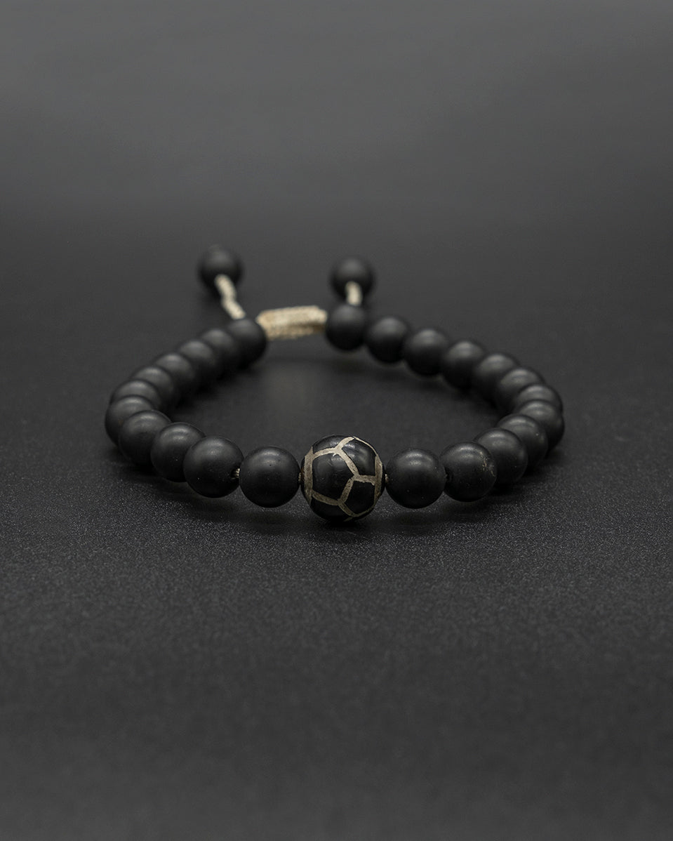 This bracelet features natural black onyx stone with a hand carved delicate net design. The deep black tone of onyx symbolizes strength, grounding, and protection.