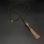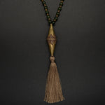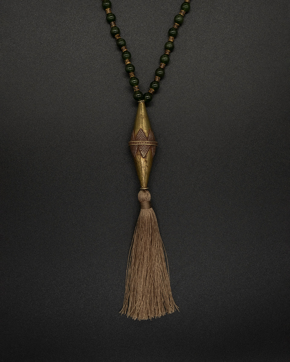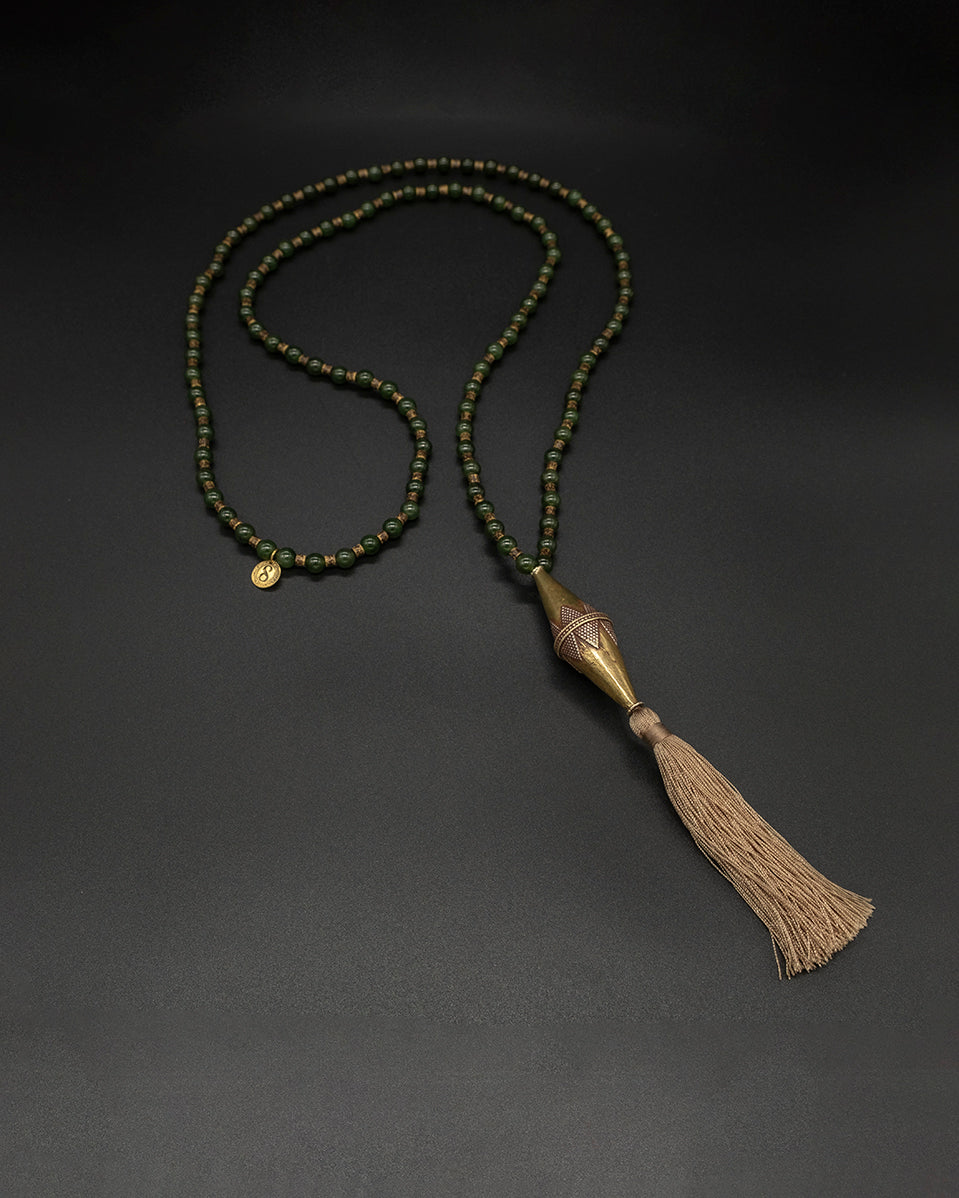 This beautiful mala is crafted from 108 Chinese jade beads, finished with a unique vintage brass guru bead and matching vintage brass chain accents for a timeless, earthy elegance.